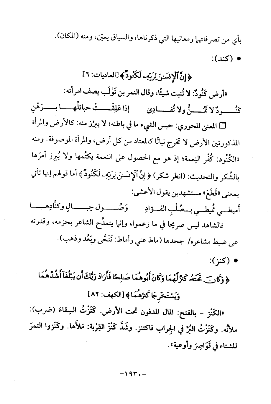 Qحبس الشيء ما في باطنه؛ لا يبرُز منه: كالأرض والمرأة المذكورتين الأرض لا تخرج نباتًا كالمعتاد من كل أرض، والمرأة الموصوفة. ومنه "الكُنُود: كُفْر النِعمة؛ إذ هو مع الحصول على النعمة يكتُمها ولا يُبرِز أمرَها بالشُكر والتحديث: (انظر شكر) {إِنَّ الْإِنْسَانَ لِرَبِّهِ لَكَنُودٌ} أما قولهم إنها تأتي بمعنى "قَطَعَ "مستشهدين يقول الأعشى: