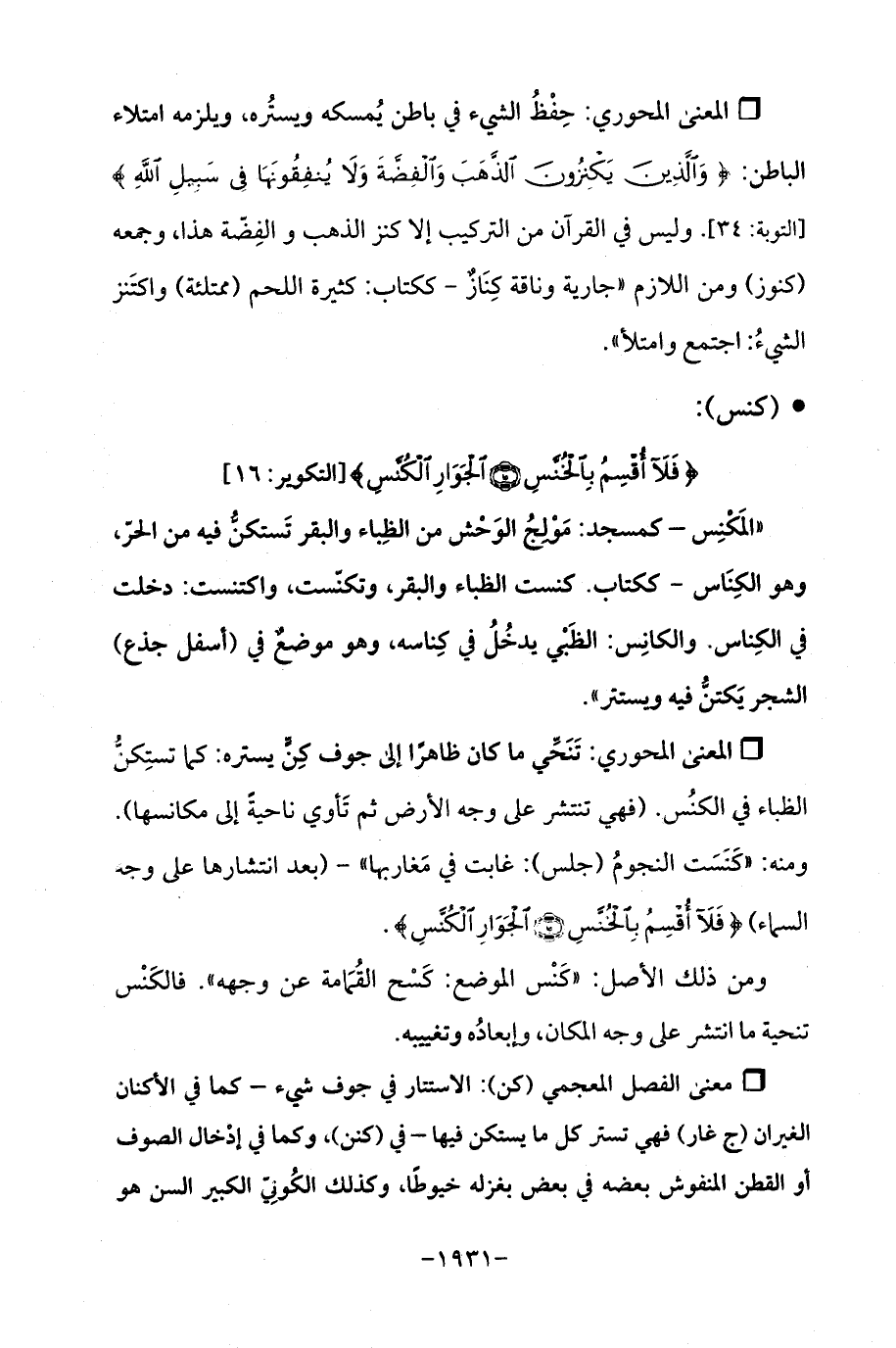 Qتَنَحِّي ما كان ظاهرًا إلى جوف كِنٍّ يستره: كما تستِكنُّ الظباء في الكنُس. (فهي تنتشر على وجه الأرض ثم تَأوي ناحيةً إلى مكانسها). ومنه: "كَنَسَت النجومُ (جلس): غابت في مَغاربها "- (بعد انتشارها على وجه السماء) {فَلَا أُقْسِمُ بِالْخُنَّسِ (15) الْجَوَارِ الْكُنَّسِ}.