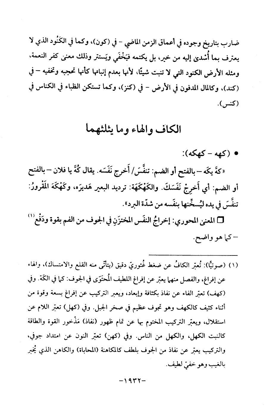 (¬1) (صوتيًّا): تُعبّر الكافُ عن ضغط غُئوريّ دقيق (يتأتّى منه القلع والامتساك)، والهاء عن إفراغ، والفصل منهما يعبّر عن إفراغ اللطيف المُحتَوَى في الجوف: كما في الكَهّ. وفي (كهف) تعبّر الفاء عن نفاذ بكثافة وإبعاد، ويعبر التركيب عن إفراغ بسعة وقوة من أثناء كثيف كالكهف وهو تجوف عظيم في صخر الجبل. وفي (كهل) تعبّر اللام عن استقلال، ويعبّر التركيب المختوم بها عن تمام ظهور (نفاذ) مَذْخور القوة والطاقة كالنبت الكهل، والكهل من الناس. وفي (كهن) تعبّر النون عن امتداد جوفي، والتركيب يعبّر عن نفاذ من الجوف بلطف كالمكاهنة (المحاباة) والكاهن الذي يُخبر بالغيب وهو خفيّ لطيف.