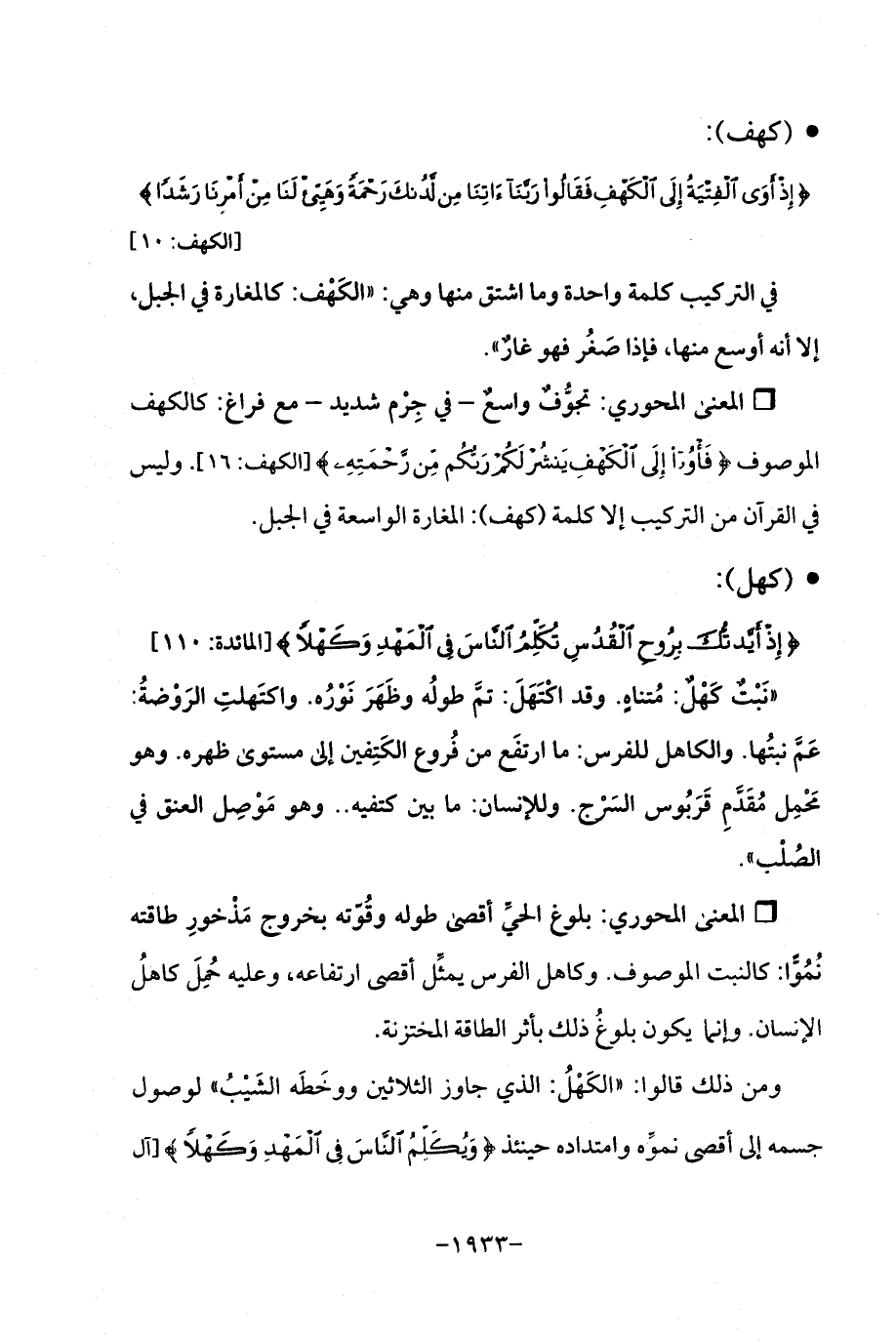 Qتجوُّفٌ واسعٌ - في جِرْم شديد - مع فراغ: كالكهف الموصوف {فَأْوُوا إِلَى الْكَهْفِ يَنْشُرْ لَكُمْ رَبُّكُمْ مِنْ رَحْمَتِهِ} [الكهف: 16]. وليس في القرآن من التركيب إلا كلمة (كهف): المغارة الواسعة في الجبل.