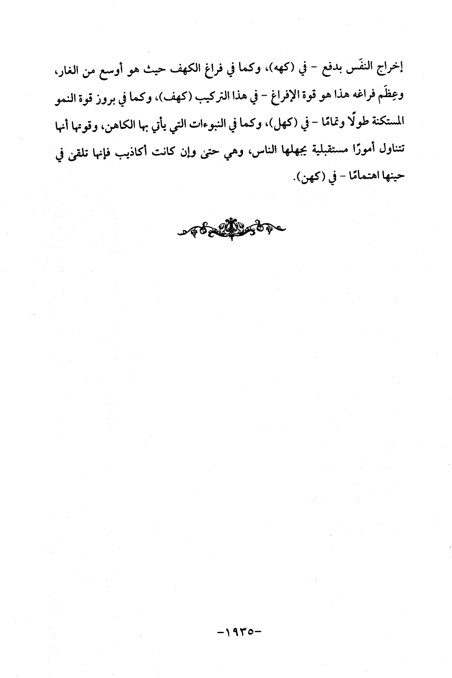 إخراج النفَس بدفع - في (كهه)، وكما في فراغ الكهف حيث هو أوسع من الغار، وعِظَم فراغه هذا هو قوة الإفراغ - في هذا التركيب (كهف)، وكما في بروز قوة النمو المستكنة طولًا وتمامًا - في (كهل)، وكما في النبوءات التى يأتي بها الكاهن، وقوتها أنها تتناول أمورًا مستقبلية يجهلها الناس، وهي حتى وإن كانت أكاذيب فإنها تلقى في حينها اهتمامًا - في (كهن).
