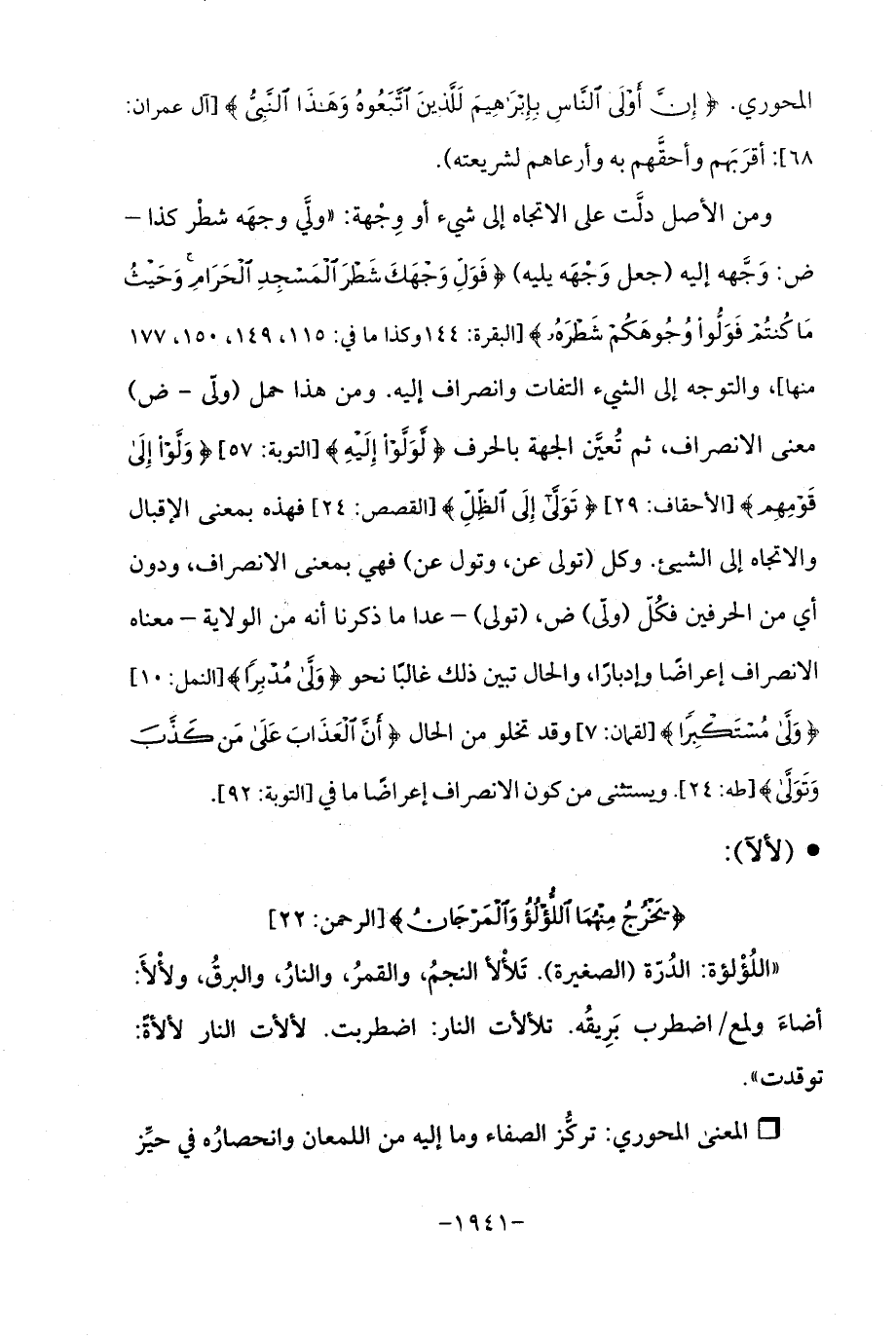 ومن الأصل دلَّت على الاتجاه إلى شيء أو وِجْهة: "ولَّي وجهَه شطْر كذا - ض: وَجَّهه إليه (جعل وَجْهَه يليه) {فَوَلِّ وَجْهَكَ شَطْرَ الْمَسْجِدِ الْحَرَامِ وَحَيْثُ مَا كُنْتُمْ فَوَلُّوا وُجُوهَكُمْ شَطْرَهُ} [البقرة: 144 وكذا ما في: 115، 149, 150, 177 منها] , والتوجه إلى الشيء التفات وانصراف إليه. ومن هذا حمل (ولّى - ض) معنى الانصراف، ثم تُعيَّن الجهة بالحرف {لَوَلَّوْا إِلَيْهِ} [التوبة: 57] {وَلَّوْا إِلَى قَوْمِهِمْ} [الأحقاف: 29] {تَوَلَّى إِلَى الظِّلِّ} [القصص: 24] فهذه بمعنى الإقبال والاتجاه إلى الشيء. وكل (تولى عن، وتول عن) فهي بمعنى الانصراف، ودون أي من الحرفين فكُلَ (ولّى) ض، (تولى) - عدا ما ذكرنا أنه من الولاية - معناه الانصراف إعراضًا وإدبارًا، والحال تبين ذلك غالبًا نحو {وَلَّى مُدْبِرًا} [النمل: 10] {وَلَّى مُسْتَكْبِرًا} [لقمان: 7] وقد تخلو من الحال {أَنَّ الْعَذَابَ عَلَى مَنْ كَذَّبَ وَتَوَلَّى} [طه: 24]. ويستثنى من كون الانصراف إعراضًا ما في [التوبة: 92].