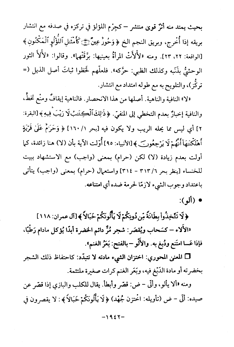 ومنه "ألا يألو، وألّى - ض: قصّر وأبطأ. يقال للكلب والبازي إذا قصّر عن صيده: ألّى - ض (تأويله: اخْتزن جُهْد) {لَا يَأْلُونَكُمْ خَبَالًا}: لا يقصرون في