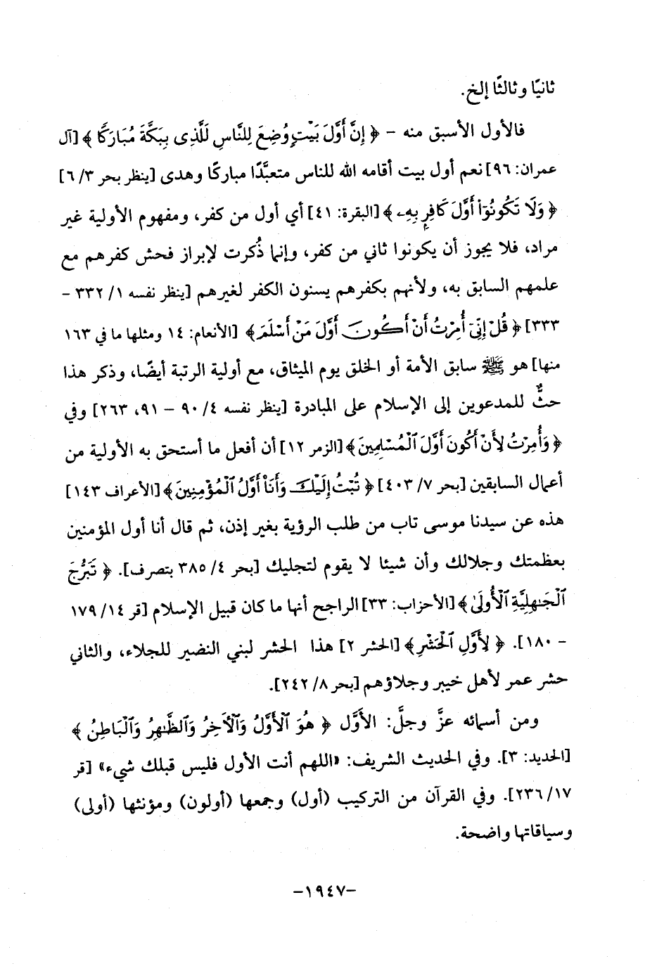 فالأول الأسبق منه - {إِنَّ أَوَّلَ بَيْتٍ وُضِعَ لِلنَّاسِ لَلَّذِي بِبَكَّةَ مُبَارَكًا} [آل عمران: 96] نعم أول بيت أقامه الله للناس متعبَّدًا مباركًا وهدى [ينظر بحر 3/ 6] {وَلَا تَكُونُوا أَوَّلَ كَافِرٍ بِهِ} [البقرة: 41] أي أول من كفر، ومفهوم الأولية غير مراد، فلا يجوز أن يكونوا ثاني من كفر، وإنما ذُكرت لإبراز فحش كفرهم مع علمهم السابق به، ولأنهم بكفرهم يسنون الكفر لغيرهم [ينظر نفسه 1/ 332 - 333] {قُلْ إِنِّي أُمِرْتُ أَنْ أَكُونَ أَوَّلَ مَنْ أَسْلَمَ} [الأنعام: 14 ومثلها ما في 163 منها] هو - صلى الله عليه وسلم -. سابق الأمة أو الخلق يوم الميثاق، مع أولية الرتبة أيضًا، وذكر هذا حثٌّ للمدعوين إلى الإِسلام على المبادرة [ينظر نفسه 4/ 90 - 91، 263] وفي {وَأُمِرْتُ لِأَنْ أَكُونَ أَوَّلَ الْمُسْلِمِينَ} [الزمر: 12] أن أفعل ما أستحق به الأولية من أعمال السابقين [بحر 7/ 403] {تُبْتُ إِلَيْكَ وَأَنَا أَوَّلُ الْمُؤْمِنِينَ} [الأعراف: 143] هذه عن سيدنا موسى تاب من طلب الرؤية بغير إذن، ثم قال أنا أول المؤمنين بعظمتك وجلالك وأن شيئا لا يقوم لتجليك [بحر 4/ 385 بتصرف]. {تَبَرُّجَ الْجَاهِلِيَّةِ الْأُولَى} [الأحزاب: 33] الراجح أنها ما كان قبيل الإِسلام [قر 14/ 179 - 180]. {لِأَوَّلِ الْحَشْرِ} [الحشر: 2] هذا الحشر لبني النضير للجلاء، والثاني حشر عمر لأهل خيبر وجلاؤهم [بحر 8/ 242].