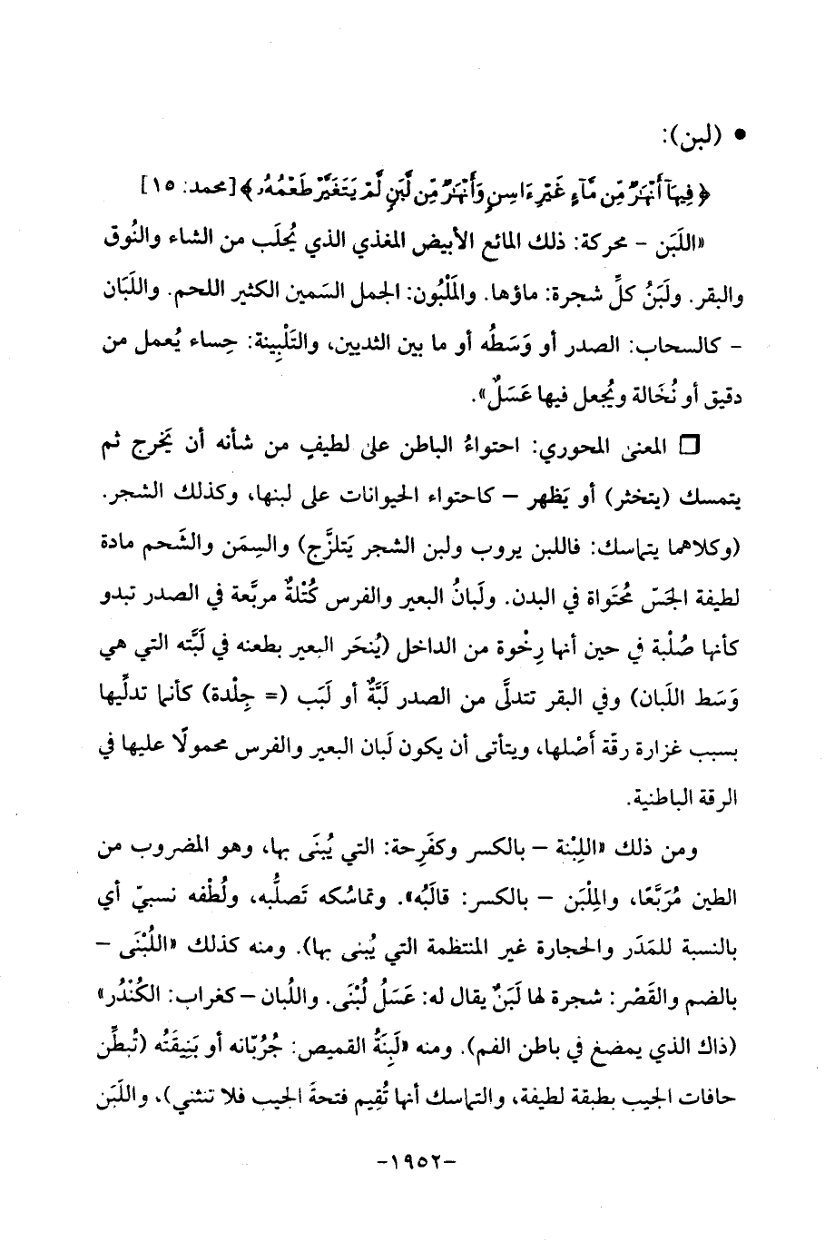 "اللَبَن - محركة: ذلك المائع الأبيض المغذي الذي يُحلَب من الشاء والنُوق والبقر. ولَبَنُ كلِّ شجرة: ماؤها. والمَلْبُون: الجمل السَمين الكثير اللحم. واللَبَان - كالسحاب: الصدر أو وَسَطُه أو ما بين الثديين، والتَلْبِينة: حِساء يُعمل من دقيق أو نُخَالة ويُجعل فيها عَسَلٌ ".