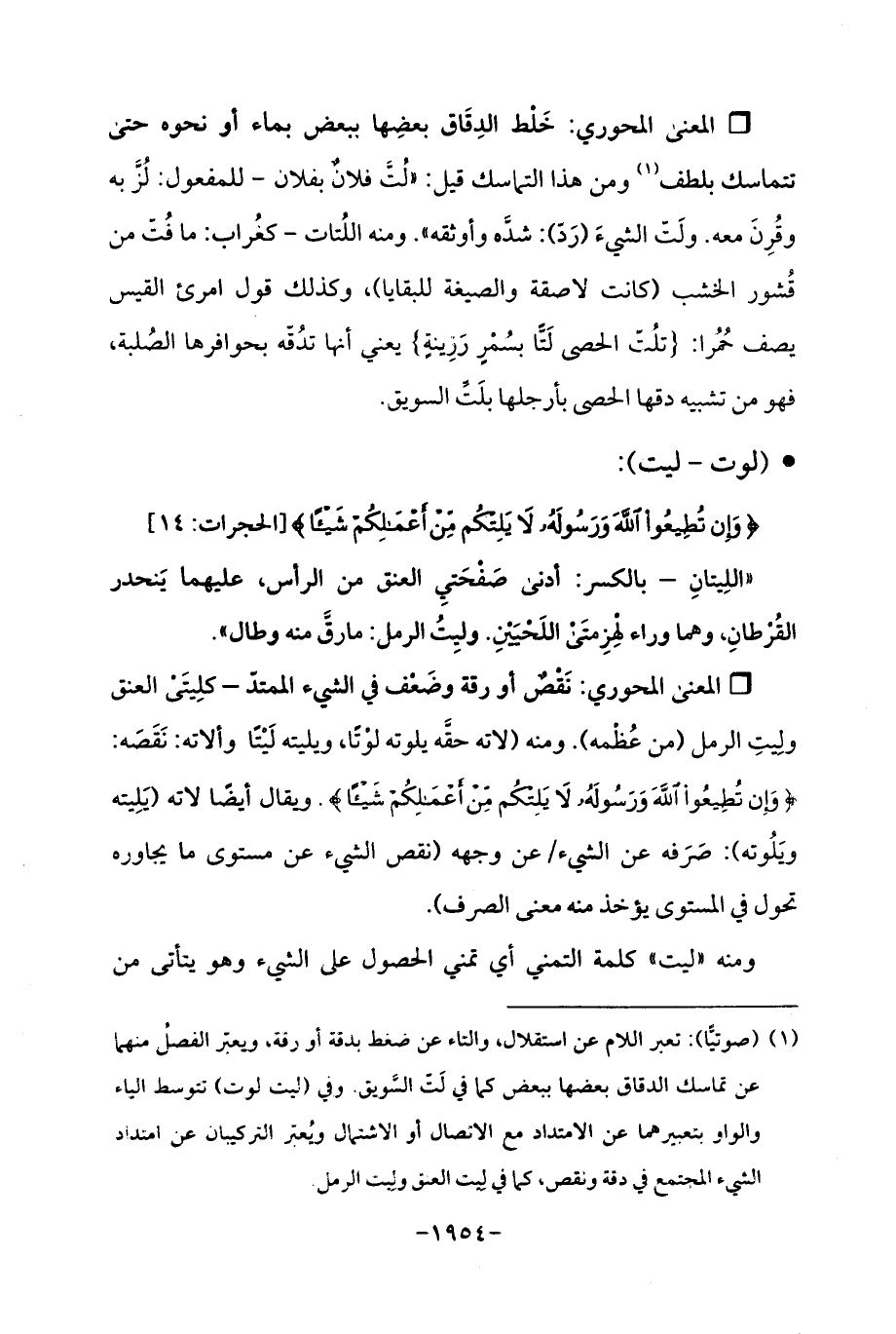 (¬1) (صوتيًّا): تعبر اللام عن استقلال، والتاء عن ضغط بدقة أو رقة, ويعتبر الفصل منهما عن تماسك الدقاق بعضها ببعض كما في لَت السَّويق. وفي (ليت لوت) تتوسط الياء والواث بتعبيرهما عن الامتداد مع الاتصال أو الاشتمال ويُعبّر التركيبان عن امتداد الشيء المجتمع في دقة ونقصر، كما في ليت العنق ولِيت الرمل.