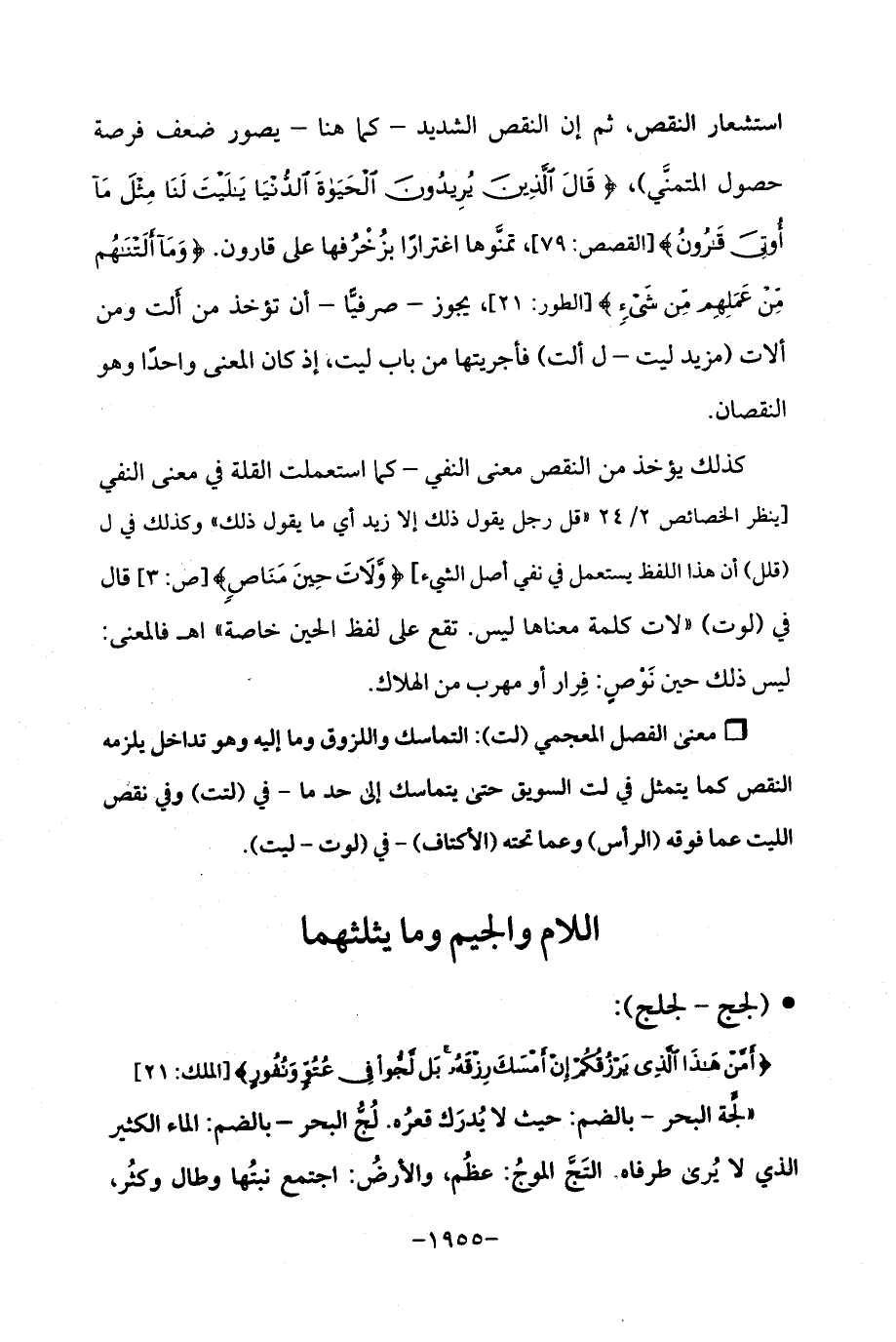 كذلك يؤخذ من النقص معنى النفي -كما استعملت القلة في معنى النفي [ينظر الخصائص 2/ 524 "قل رجل يقول ذلك إلا زيد أي ما يقول ذلك "وكذلك في ل (قلل) أن هذا اللفظ يتعمل في نفي أصل الشيء] {وَلَاتَ حِينَ مَنَاصٍ} [ص: 3] قال في (لوت) "لات كلمة معناها ليس. تقع على لفظ العين خاصة "اهـ فالمعنى: ليس ذلك حين نَوْصٍ: فِرار أو مهرب من الهلاك.