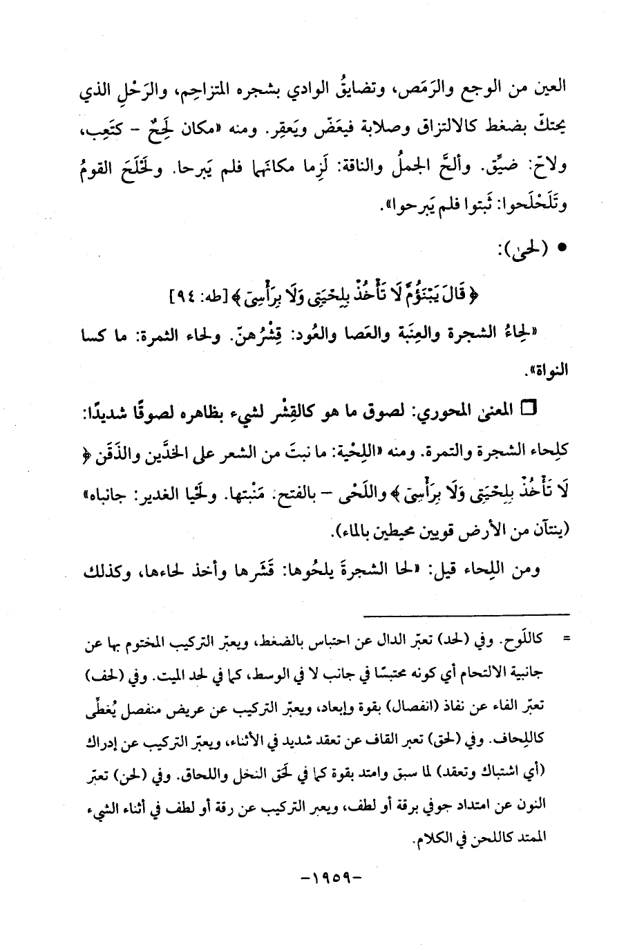 Qلصوق ما هو كالقِشر لشيء بظاهره لصوقًا شديدًا: كلِحاء الشجرة والتمرة. ومنه "اللِحية: ما نبتَ من الشعر على الخدَّين والذَقَن {لَا تَأْخُذْ بِلِحْيَتِي وَلَا بِرَأْسِي} واللَحى -بالفتح؛ مَنْبتها. ولحَيا الغدير: جانباه " (ينتآن من الأرض قويين محيطين بالماء).