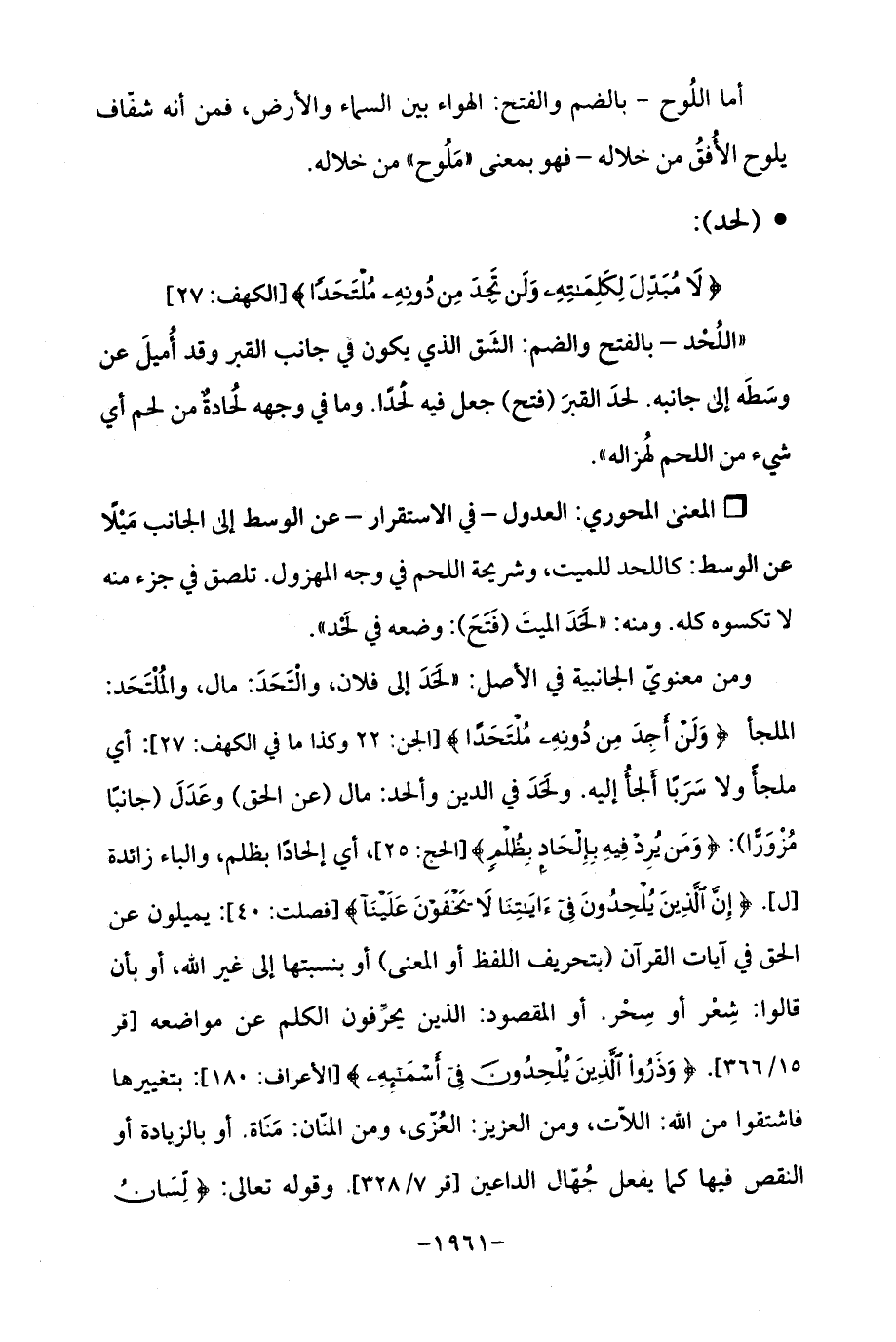 ومن معنويّ الجانبية في الأصل: "لحَدَ إلى فلان، والتَحَدَ: مال، والمُلْتَحَد: الملجأ {وَلَنْ أَجِدَ مِنْ دُونِهِ مُلْتَحَدًا} [الجن: 22 وكذا ما في الكهف: 27]: أي ملجأ ولا سَرَبَا ألجاُ إليه. ولحَدَ في الدين وألحد: مال (عن الحق) وعَدَلَ (جانبا مُزْورا): {وَمَنْ يُرِدْ فِيهِ بِإِلْحَادٍ بِظُلْمٍ} [الحج: 25]، أي إلحادًا بظلم، والباء زائدة [ل]. {إِنَّ الَّذِينَ يُلْحِدُونَ فِي آيَاتِنَا لَا يَخْفَوْنَ عَلَينَا} [فصلت: 40]: يميلون عن الحق في آيات القرآن (بتحريف اللفظ أو المعنى) أو بنسبتها إلى غير الله، أو بأن قالوا: شعْر أو سِحر. أو المقصود: الذين يحرفون الكلم عن مواضعه [قر 15/ 366]. {وَذَرُوا الَّذِينَ يُلْحِدُونَ فِي أَسْمَائِهِ} [الأعراف: 180] بتغييرها فاشتقوا من الله: اللات، ومن العزيز: العُزى، ومن المنّان: مَنَاة. أو بالزيادة أو النقص فيها كما يفعل جهال الداعين [قر 7/ 328]. وقوله تعالى: {لسان