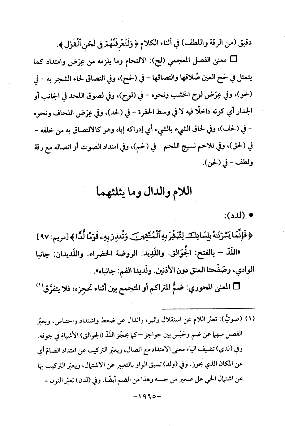 (¬1) (صوتيا). تعبِّر اللام عن استقلال وتميزه؛ والدال عن ضعط واشتداد واحتباس، ويعبر الفصل منهما عن ضم وحبس بين حواجز -كما يحجُز اللَد (الجوالق) الأشياة في جوفه. وفي (لدى) تضيف الياء معنى الامتداد مع اتصال، ويعبر التركيب عن امتداد الضام أي عن المكان الذي يجوز. وفي (ولد) تسبق الواو بالتعببر عن الاشتمال، ويعبر التركيب بها عن اشتمال الحي على صغير من جنسه وهذا من الضم أيضًا. وفي (لدن) تعبر النون=