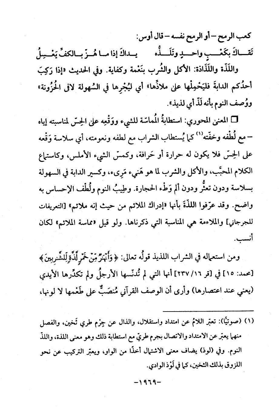 ومن استعماله في الشراب اللذيذ قولُه تعالى: {وَأَنْهَارٌ مِنْ خَمْرٍ لَذَّةٍ لِلشَّارِبِينَ} [محمد: 15] في [قر 16/ 237] أنها التي لم تُدنسها الأرجلُ ولم تكدِّرها الأيدي (يعني عند اعتصارها) وأرى أن الوصف القرافي مُنصَب على طَعمها لا لونها،