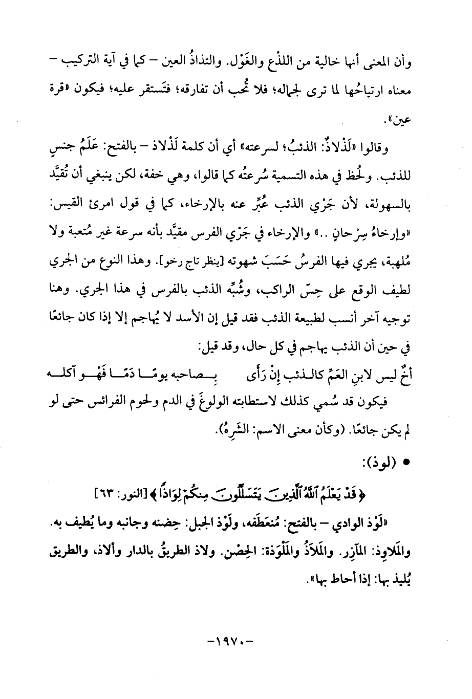 وقالوا "لَذْلاذٌ: الذئبُ؛ لسرعته "أي أن كلمة لَذلاذ- بالفتح: عَلَمُ جنس للذئب. ولحظ في هذه التسمية سُرعتُه كما قالوا، وهي خفة، لكن ينبغي أن تُقيد بالسهولة، لأن جرْي الذئب عُبِّر عنه بالإرخاء، كما في قول امرئ القيس: "وإرخاءُ سرحان ... "والإرخاء في جري الفرس مقيد بأنه سرعة غير مُتعبة ولا مُلهبة، مجري فيها الفرسُ حَسَبَ شهوته [ينظر تاج رخو]. وهذا النوع من الجري لطيف الوقع على حِس الراكب، وشُبه الذئب بالفرس في هذا الجري. وهنا توجيه آخر أنسب لطبيعة الذئب فقد قيل إن الأسد لا يُهاجم إلا إذا كان جائعًا في حين أن الذئب يهاجم في كل حال، وقد قيل: