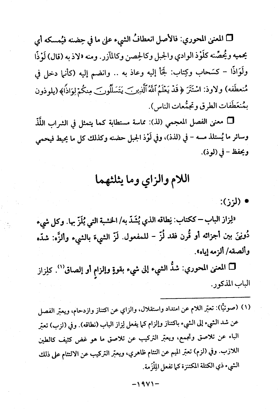 ° معنى الفصل المعجمي (لذ): مماسة مستطابة كما يتمثل في الشراب اللّذ وسائر ما يُستلذ مسه- في (لذذ)، وفي لَوذ الجبل حضنه وكذلك كل ما يحيط فيحمي ويحفظ- في (لوذ).