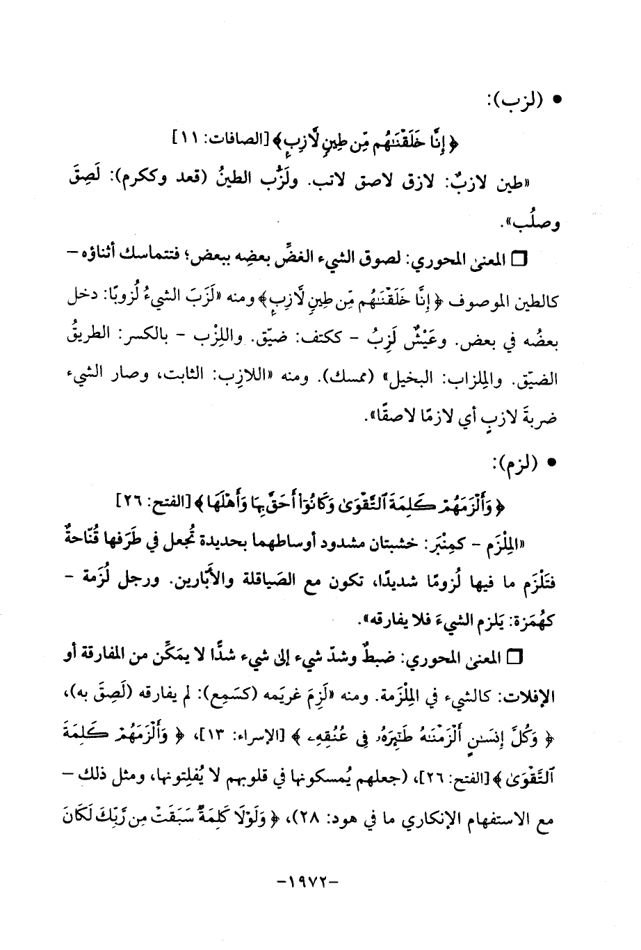 Qضبط وشدّ شيء إلي شيء شدّا لا يمَكِّن من المفارقة أو الإفلات: كالشيء في المِلْزَمة. ومنه "لَزِمَ غريَمه (كسَمِع): يفارقه (لَصِقَ به)، {وَكُلَّ إِنْسَانٍ أَلْزَمْنَاهُ طَائِرَهُ فِي عُنُقِهِ} [الإسراء: 13]، {وَأَلْزَمَهُمْ كَلِمَةَ التَّقْوَى} [الفتح: 26]، (جعلهم يُمسكونها في قلوبهم لا يُفلِتونها، ومثل ذلك- مع الاستفهام الإنكاري ما في هود: 28)، {وَلَوْلَا كَلِمَةٌ سَبَقَتْ مِنْ رَبِّكَ لَكَانَ