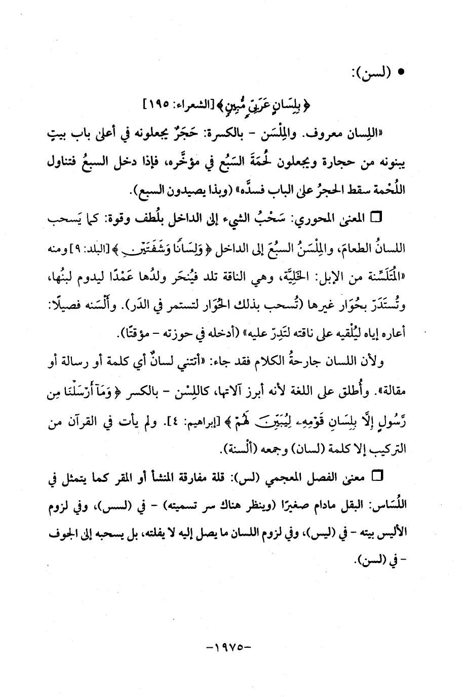 ولأن اللسان جارحةُ الكلام فقد جاء: "أتتني لسانٌ أي كلمة أو رسالة أو مقالة ". وأطلق على اللغة لأنه أبرز آلاتها، كاللِسن -بالكسر {وَمَا أَرْسَلْنَا مِنْ رَسُولٍ إلا بِلِسَانِ قَوْمِهِ لِيُبَيِّنَ لَهُمْ} [إبراهيم: 4]. ولم يأت في القرآن من التركيب إلا كلمة (لسان) وجمعه (ألسنة).