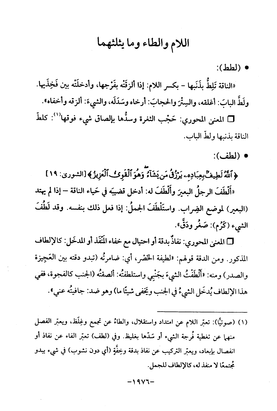 (¬1) (صوتيًّا): تعبر اللام عن امتداد واستقلال. والطاءُ عن تجمع وغلَظ، ويعبر الفصل منهما عن تغطية فُرجة الشيء أو سدّها بغليظ. وفي (لطف) تعبر الفاء عن نفاذ أو انفصال بإبعاد، ويعتر التركيب عن نفاذ بدقة وخِفّة (أي دون نشوب) في شيء يبدو مجتمعًا لا منفذ له، كالإلطاف للجمل.