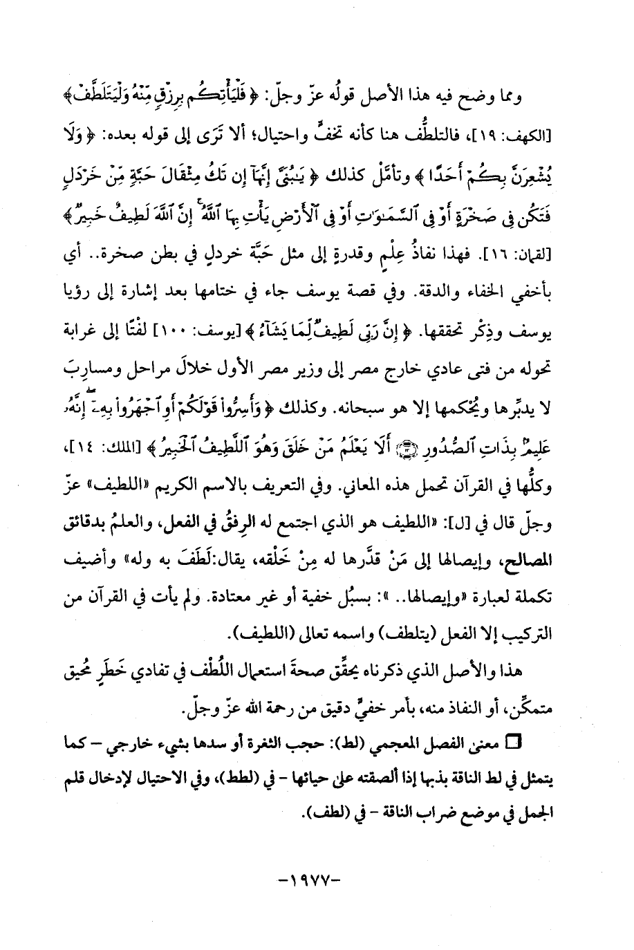 ومما وضح فيه هذا الأصل قولُه عزَّ وجلَّ: {فَلْيَأْتِكُمْ بِرِزْقٍ مِنْهُ وَلْيَتَلَطَّفْ} [الكهف: 19]، فالتلطُف هنا كأنه تخفٍّ واحتيال؛ ألا ترَى إلى قوله بعده: {وَلَا يُشْعِرَنَّ بِكُمْ أَحَدًا} وتأملْ كذلك {يَابُنَيَّ إِنَّهَا إِنْ تَكُ مِثْقَال حَبَّةٍ مِنْ خَرْدَلٍ فَتَكُنْ فِي صَخْرَةٍ أَوْ فِي السَّمَاوَاتِ أَوْ فِي الْأَرْضِ يَأْتِ بِهَا اللَّهُ إِنَّ اللَّهَ لَطِيفٌ خَبِيرٌ} [لقمان: 16]. فهذا نفاذُ عِلمٍ وقدرة إلى مثل حَبّة خردلٍ في بطن صخرة .. أي بأخفي الخفاء والدقة. وفي قصة يوسف جاء في ختامها بعد إشارة إلى رؤيا يوسف وذِكْر تحققها. {إِنَّ رَبِّي لَطِيفٌ لِمَا يَشَاءُ} [يوسف: 100] لفتًا إلى غرابة تحوله من فتى عادي خارج مصر إلى وزير مصر الأول خلال مراحل ومسارِبَ لا يدبَرها ويُحْكمها إلا هو سبحانه. وكذلك {وَأَسِرُّوا قَوْلَكُمْ أَو اجْهَرُوا بِهِ إِنَّهُ عَلِيمٌ بِذَاتِ الصُّدُورِ (13) أَلَا يَعْلَمُ مَنْ خَلَقَ وَهُوَ اللَّطِيفُ الْخَبِيرُ} [الملك: 13]، وكلُّها في القرآن تحمل هذه المعاني. وفي التعريف بالاسم الكريم "اللطيف "عز وجلّ قال في [ل]: "اللطيف هو الذي اجتمع له الرِفقُ في الفعل، والعلمُ بدقائق المصالح، وإيصالها إلى مَنْ قدّرها له مِنْ خَلقه، يقال: لَطَفَ به وله "وأضيف تكملة لعبارة "وإيصالها .. ": بسبُل خفية أو غير معتادة. ولم يأت في القرآن من التركيب إلا الفعل (يتلطف) واسمه تعالى (اللطيف).