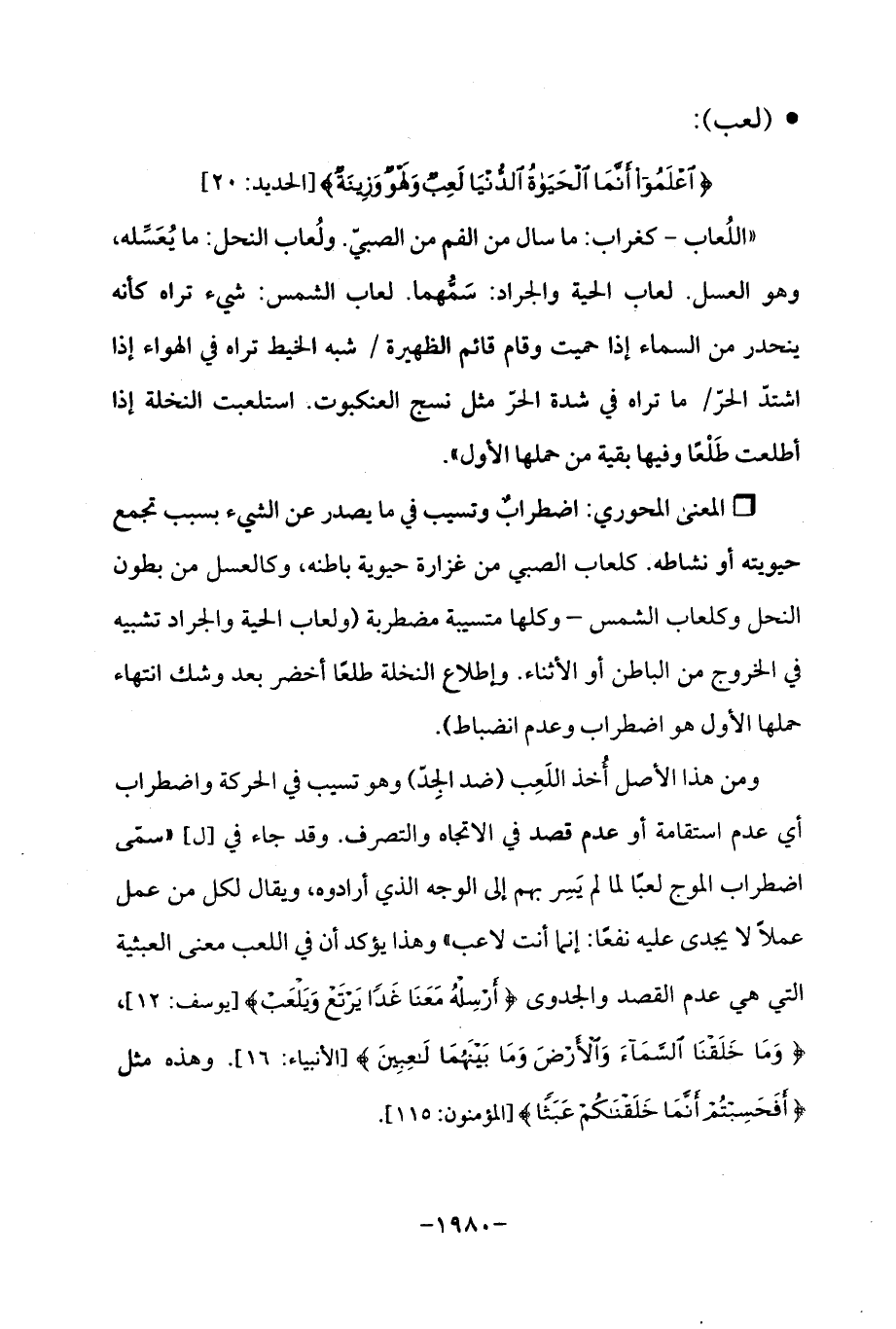 ومن هذا الأصل أُخذ اللَعِب (ضد الجِدّ) وهو تسيب في الحركة واضطراب أي عدم استقامة أو عدم قصد في الاتجاه والتصرف. وقد جاء في [ل]. "سمى اضطراب الموج لعبًا لما لم يَسِر بهم إلى الوجه الذي أرادوه، ويقال لكل من عمل عملًا لا يجدى عليه نفعًا: إنما أنت لاعب "وهذا يؤكد أن في اللعب معنى العبثية التي هي عدم القصد والجدوى {أَرْسِلْهُ مَعَنَا غَدًا يَرْتَعْ وَيَلْعَبْ} [يوسف: 12]، {وَمَا خَلَقْنَا السَّمَاءَ وَالْأَرْضَ وَمَا بَينَهُمَا لَاعِبِينَ} [الأنبياء: 16]. وهذه مثل {أَفَحَسِبْتُمْ أَنَّمَا خَلَقْنَاكُمْ عَبَثًا} [المؤمنون: 115].