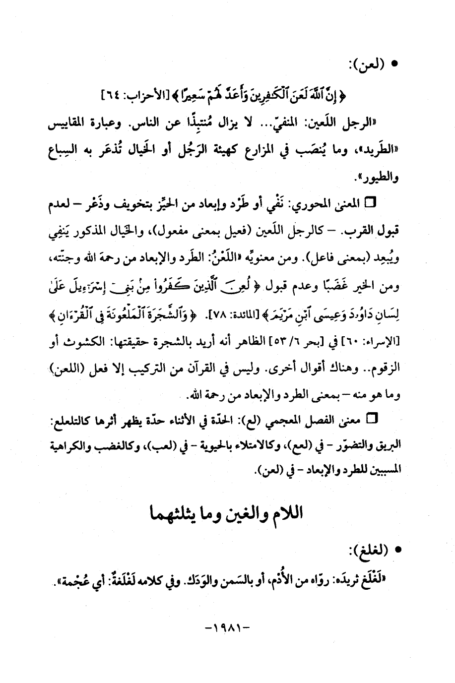 Qنَفْي أو طَرد وإبعاد من الحيّز بتخويف وذَعر -لعدم قبول القرب.- كالرجل اللَعين (فعيل بمعنى مفعول)، والجيال المذكور يَنفِي ويُبعِد (بمعنى فاعل). ومن معنويِّه "اللَعْنُ: الطَرد والإبعاد من رحمهَ الله وجنته، ومن الخير غَضَبًا وعدم قبول {لُعِنَ الَّذِينَ كَفَرُوا مِنْ بَنِي إِسْرَائِيلَ عَلَى لِسَانِ دَاوُودَ وَعِيسَى ابْنِ مَرْيَمَ} [المائدة: 78]. {وَالشَّجَرَةَ الْمَلْعُونَةَ فِي الْقُرْآنِ} [الإسراء: 60] في [بحر 6/ 53] الظاهر أنه أريد بالشجرة حقيقتها: الكشوث أو الزقوم .. وهناك أقوال أخرى. وليس في القرآن من التركيب إلا فعل (اللعن) وما هو منه- بمعنى الطرد والإبعاد من رحمة الله.