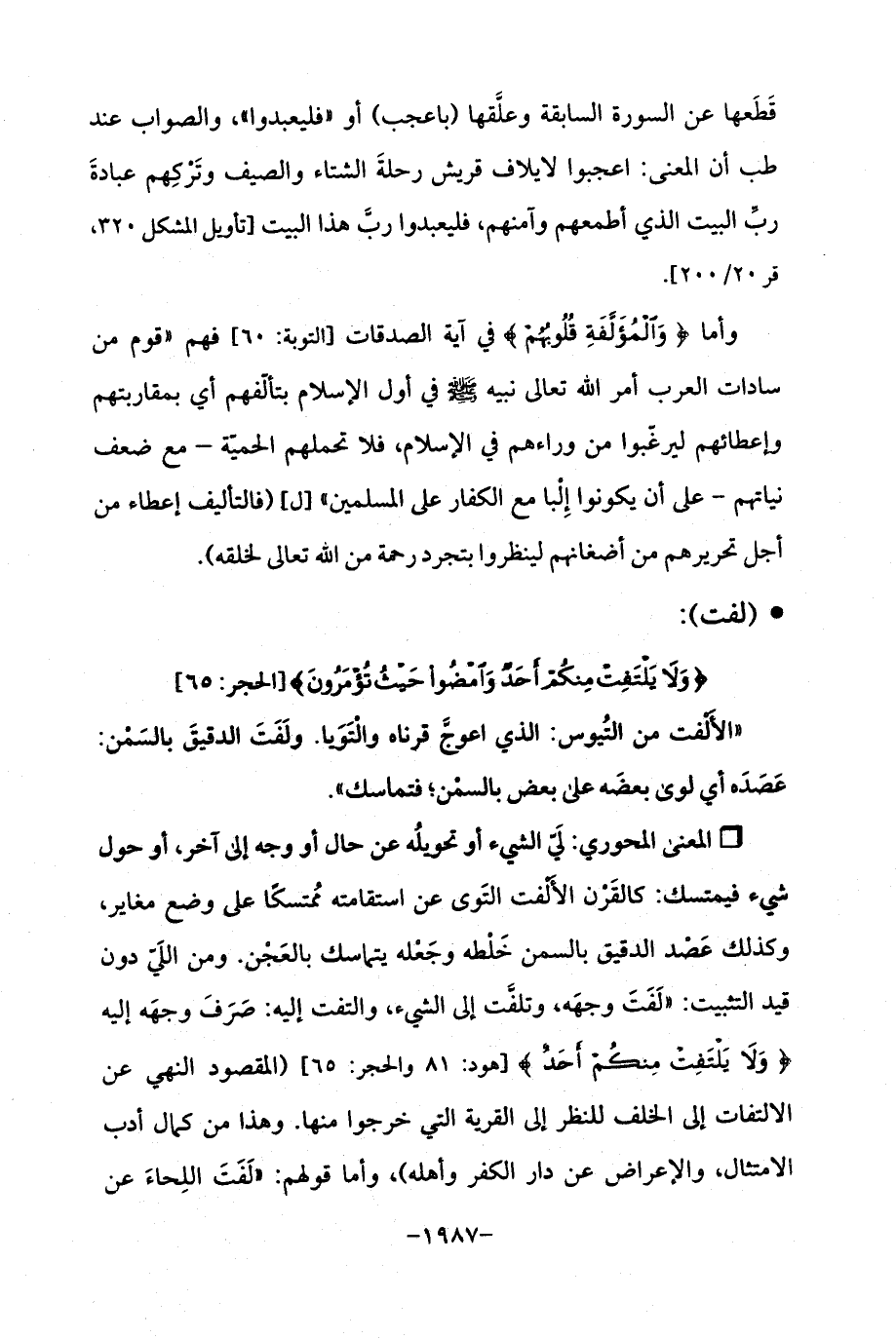 وأما {وَالْمُؤَلَّفَةِ قُلُوبُهُمْ} في آية الصدقات [التوبة: 60] فهم "قوم من سادات العرب أمر الله تعالى نبيه - صلى الله عليه وسلم - في أول الإسلام بتألّفهم أي بمقاربتهم وإعطائهم ليرغّبوا من وراءهم في الإسلام، فلا تحملهم الحميّة -مع ضعف نياتهم- على أن يكونوا إِلْبا مع الكفار على المسلمين " [ل] (فالتأليف إعطاء من أجل تحريرهم من أضغانهم لينظروا بتجرد رحمة من الله تعالى لخلقه).