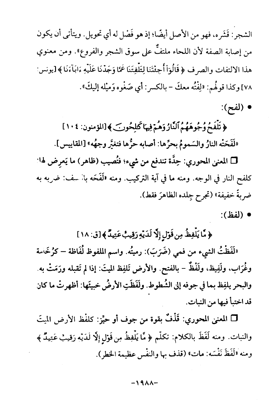 Qقَذْفٌ بقوة من جوف أو حيِّز: كلفْظ الأرض الميتَ والنبات. ومنه لَفَظَ بالكلام: تكلّم {مَا يَلْفِظُ مِنْ قَوْلٍ إلا لَدَيهِ رَقِيبٌ عَتِيدٌ} ومنه "لَفَظَ نَفْسَه: مات " (قذف بها والنفْس عظيمة الخطر).