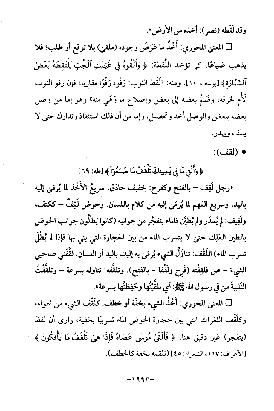 Qأَخْذُ الشيء بخفة أو خطف: كلَقف الشيء من الهواء، وكلَقْف الثغرات التي بين حجارة الحوض الماء تسريبًا بخفية، وأرى أن لفظ (يتفجر) غير دقيق هنا. {فَأَلْقَى مُوسَى عَصَاهُ فَإِذَا هِيَ تَلْقَفُ مَا يَأْفِكُونَ} [الأعراف: 117, الشعراء: 45] (تلقمه بخفة كالخطف).