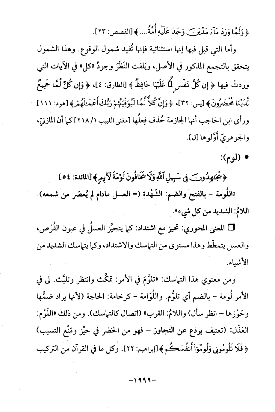 ومن معنوي هذا التماسك: "تلوَّمَ في الأمر: تمكَّث وانتظر وتلبَّث. لي في الأمر لُومة -بالضم أي تلوُّم. واللُوَامة- كرخامة: الحاجة (لأنها يراد ضمُّها وحَوْزها - انظر سأل) واللامُ: القرب " (اتصال كالتماسك). ومن ذلك "اللَوْم: العَذْل " (تعنيف يردع عن التجاوز -فهو من الحضر في حيِّز ومَنْع التسيب) {فَلَا تَلُومُونِي وَلُومُوا أَنْفُسَكُمْ} [إبراهيم: 22]. وكل ما في القرآن من التركيب