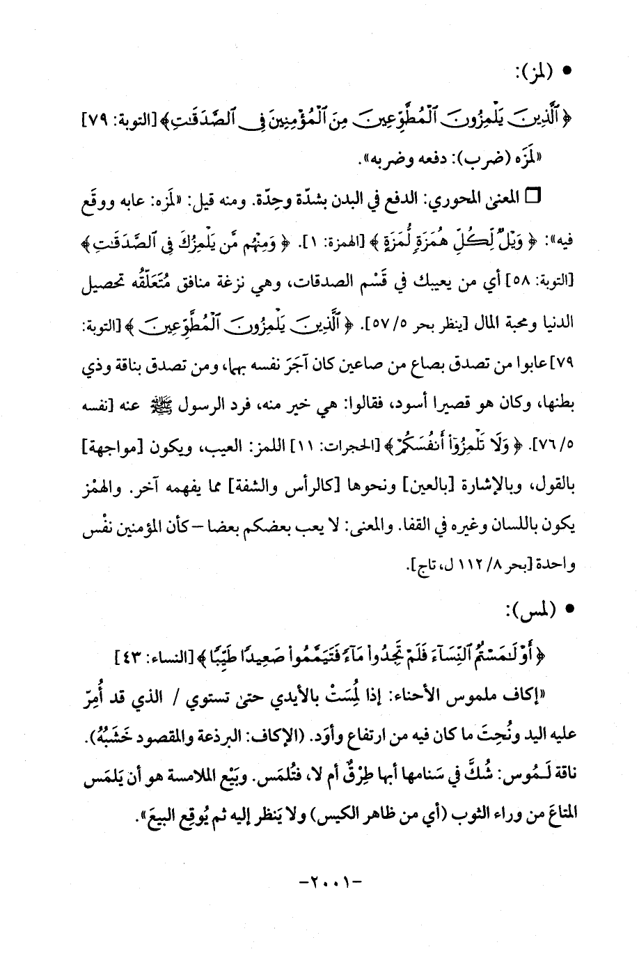 Qالدفع في البدن بشدّة وحِدّة. ومنه قيل: "لمَزه: عابه ووقَع فيِه ": {وَيلٌ لِكُلِّ هُمَزَةٍ لُمَزَةٍ (1)} [الهمزة: 1]. {وَمِنْهُمْ مَنْ يَلْمِزُكَ فِي الصَّدَقَاتِ} [التوبة: 58] أي من يعيبك في قَسْم الصدقات، وهي نزغة منافق مُتَعَلّقُه تحميل الدنيا ومحبة المال [ينظر بحر 5/ 57]. {الَّذِينَ يَلْمِزُونَ الْمُطَّوِّعِينَ} [التوبة: 79] عابوا من تصدق بصاع من صاعين كان آجَرَ نفسه بهما، ومن تصدق بناقة وذي بطنها، وكان هو قصيرا أسود، فقالوا: هي خير منه، فرد الرسول - صلى الله عليه وسلم - عنه [نفسه 5/ 76]. {وَلَا تَلْمِزُوا أَنْفُسَكُمْ} [الحجرات: 11] اللمز: العيب، ويكون [مواجهة] بالقول، وبالإشارة [بالعين] ونحوها [كالرأس والشفة] مما يفهمه آخر. والهمز يكون باللسان وغيره في القفا. والمعنى: لا يعب بعضكم بعضا- كأن المؤمين نفْس واحدة [بحر 8/ 112 ل، تاج].