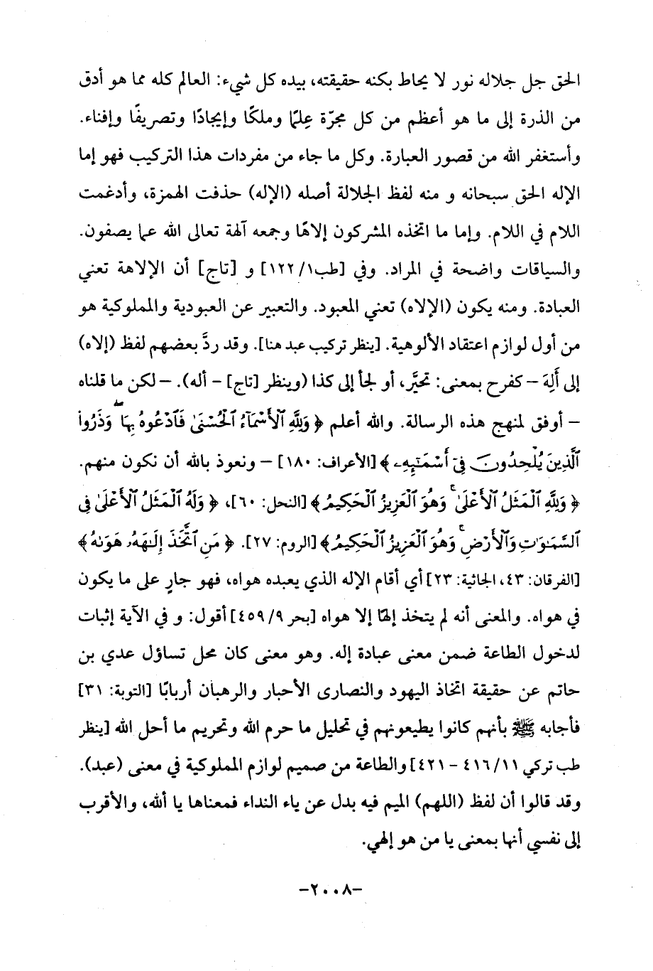 الحق جل جلاله نور لا يحاط بكنه حقيقته، بيده كل شيء: العالم كله مما هو أدق من الذرة إلى ما هو أعظم من كل مجرّة عِلمًا وملكًا وإيجادًا وتصريفًا وإفناء. وأستغفر الله من قصور العبارة. وكل ما جاء من مفردات هذا التركيب فهو إما الإله الحق سبحانه ومنه لفظ الجلالة أصله (الإله) حذفت الهمزة، وأدغمت اللام في اللام. وإما ما اتخذه المشركون إلاهًا وجمعه آلهة تعالى الله عما يصفون. والسياقات واضحة في المراد. وفي [طب 1/ 122] و [تاج] أن الإلاهة تعني العبادة. ومنه يكون (الإلاه) تعني المعبود. والتعبير عن العبودية والمملوكية هو من أول لوازم اعتقاد الألوهية. [ينظر تركيب عبد هنا]. وقد رد بعضهم لفظ (إلاه) إلى أَلِهَ- كفرح بمعنى: تحيَّر، أو لجأ إلى كذا (وينظر [تاج]- أله).- لكن ما قلناه -أوفق لمنهج هذه الرسالة. والله أعلم {وَلِلَّهِ الْأَسْمَاءُ الْحُسْنَى فَادْعُوهُ بِهَا وَذَرُوا الَّذِينَ يُلْحِدُونَ فِي أَسْمَائِهِ} [الأعراف: 180]- ونعوذ بالله أن نكون منهم. {وَلِلَّهِ الْمَثَلُ الْأَعْلَى وَهُوَ الْعَزِيزُ الْحَكِيمُ} [النحل: 60]، {وَلَهُ الْمَثَلُ الْأَعْلَى فِي السَّمَاوَاتِ وَالْأَرْضِ وَهُوَ الْعَزِيزُ الْحَكِيمُ} [الروم: 27]. {مَنِ اتَّخَذَ إِلَهَهُ هَوَاهُ} [الفرقان: 43، الجاثية: 23] أي أقام الإله الذي يعبده هواه، فهو جارٍ على ما يكون في هواه. والمعنى أنه لم يتخذ إلهًا إلا هواه [بحر 9/ 459] أقول: وفي الآية إثبات لدخول الطاعة ضمن معنى عبادة إله. وهو معنى كان محل تساؤل عدي بن حاتم عن حقيقة اتخاذ اليهود والنصارى الأحبار والرهبان أربابًا [التوبة: 31] فأجابه - صلى الله عليه وسلم - بأنهم كانوا يطيعوضهم في تحليل ما حرم الله وتحريم ما أحل الله [ينظر طب تركي 11/ 416 - 421] والطاعة من صميم لوازم المملوكية في معنى (عبد). وقد قالوا أن لفظ (اللهم) الميم فيه بدل عن ياء النداء فمعناها يا ألله، والأقرب إلى نفسي أنها بمعنى يا من هو إلهي.