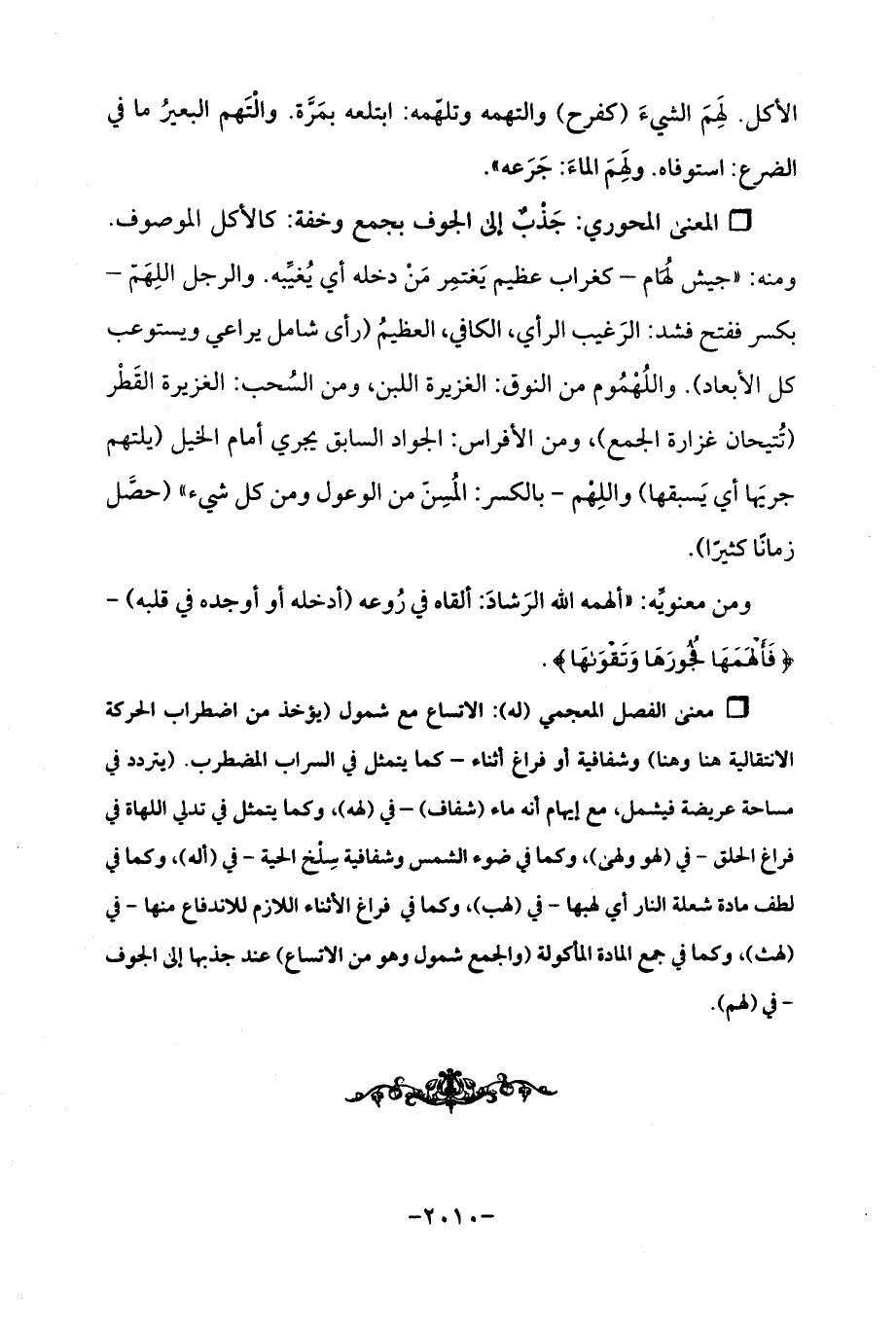 Qجَذْبٌ إلى الجوف بجمع وخفة: كالأكل الموصوف. ومنه: "جيش لُهَام -كغراب عظيم يَغتمِر مَنْ دخله أي يُغيِّبه. والرجل اللِهَم- بكسر ففتح فشد: الرَغيب الرأي، الكافي، العظيمُ (رأى شامل يراعي ويستوعب كل الأبعاد). واللُهْمُوم من النوق: الغزيرة اللبن، ومن السُحب: الغزيرة القَطْر (تُتيحان غزارة الجمع)، ومن الأفراس: الجواد السابق مجري أمام الخيل (يلتهم جريَها أي يَسبقها) واللِهْم- بالكسر: المُسِنّ من الوعول ومن كل شيء " (حصَّل زمانًا كثيرًا).