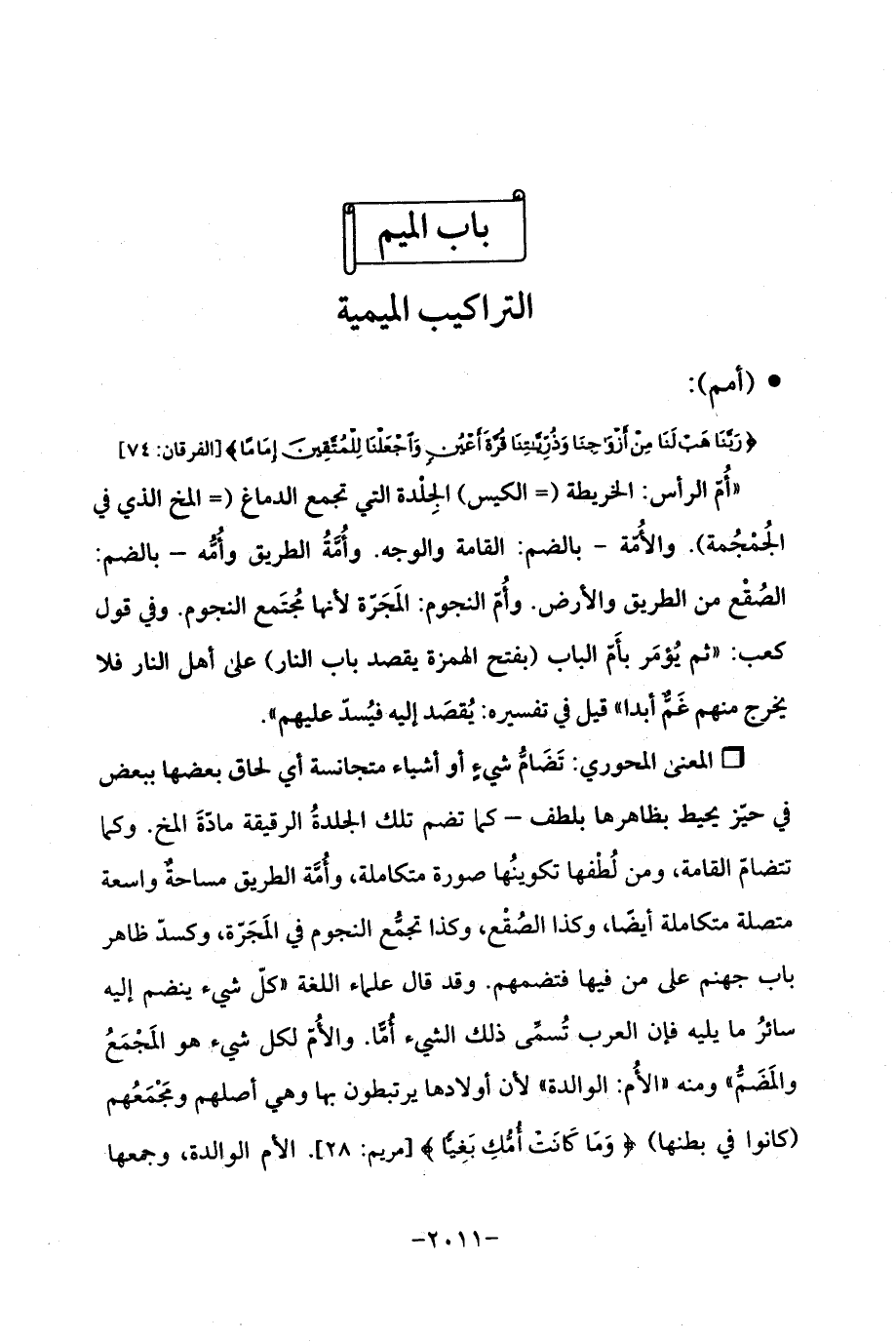 Qتَضَامُّ شيءٍ أو أشياء متجانسة أي لحاق بعضها ببعض في حيّز يحيط بظاهرها بلطف -كما تضم تلك الجلدةُ الرقيقة مادّةَ المخ. وكما تتضامّ القامة، ومن لُطفها تكوينُها صورة متكاملة، وأُمَّة الطريق مساحةٌ واسعة متصلة متكاملة أيضًا، وكذا الصُقع، وكذا تجمُّع النجوم في المَجَرّة، وكسدّ ظاهر باب جهنم على من فيها فتضمهم. وقد قال علماء اللغة "كلّ شيء ينضم إليه سائرُ ما يليه فإن العرب تُسمى ذلك الشيء أُمًّا. والأُمّ لكل شيء هو المَجمَعُ والمَضَمُّ ". ومنه "الأُم: الوالدة "لأن أولادها يرتبطون بها وهي أصلهم ومَجْمَعُهم (كانوا في بطنها) {وَمَا كَانَتْ أُمُّكِ بَغِيًّا} [مريم: 28]. الأم الوالدة، وجمعها