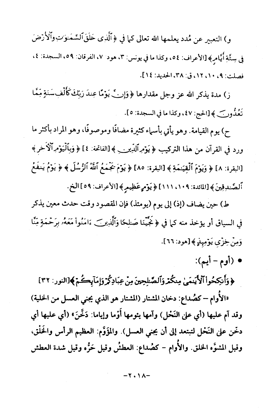 ح) يوم القيامة. وهو يأتي بأسماء كثيرة مضافًا وموصوفًا، وهو المراد بأكثر ما ورد في القرآن من هذا التركيب {يَوْمِ الدِّينِ} [الفاتحة: 4، {وَبِالْيَوْمِ الْآخِرِ} [البقرة: 8]، {وَيَوْمَ الْقِيَامَةِ} [البقرة: 85] {يَوْمَ يَجْمَعُ الله الرُّسُلَ} {يَوْمُ يَنْفَعُ الْصَّدِقِينَ} [المائدة: 109، 111]، {يَوْمٍ عَظِيمٍ} [الأعراف: 59] الخ.