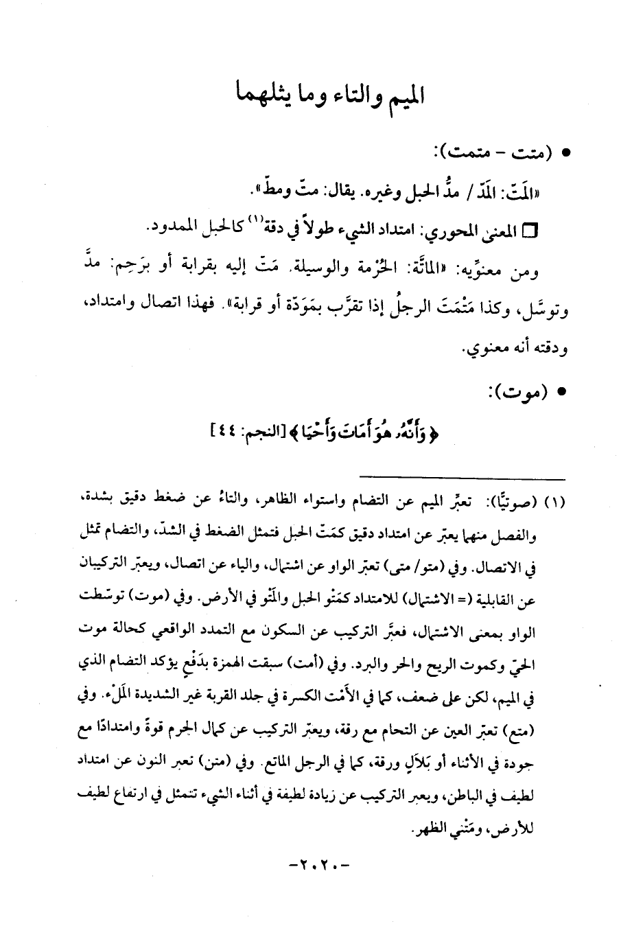 (¬1) (صوتيًّا): تعبِّر الميم عن التضام واستواء الظاهر، والتاءُ عن ضغط دقيق بشدة، والفصل منهما يعبّر عن امتداد دقيق كمَتّ الحبل فتمثل الضغط في الشدّ، والتضام تمثل في الاتصال. وفي (متو / متى) تعتبر الواو عن اشتمال، والياء عن اتصال، ويعبَّر التركيبان عن القابلية (= الاشتمال) للامتداد كمَتْو الحبل والمَثْو في الأرض. وفي (موت) توسَّطت الواو بمعنى الاشتمال، فعبَّر التركيب عن السكون مع التمدد الواقعي كحالة موت الحي وكموت الريح والحر والبرد. وفي (أمت) سبقت الهمرْة بدَفْعٍ يؤكد التضام الذي في الميم، لكن على ضعف، كما في الأَمْت الكسرة في جلد القربة غير الشديدة المَلْء. وفي (متع) تعبّر العين عن التحام مع رقة، ويعبّر التركيب عن كمال الجرم قوةً وامتدادًا مع جودة في الأثناء أو بَلَالٍ ورقة، كما في الرجل الماتع. وفي (متن) تعبر النون عن امتداد لطف في الباطن، وبعبر التركيب عن زيادة لطيفة في أثناء الشيء تتمثل في ارتفاع لطيف للأرض، ومَتْني الظهر.