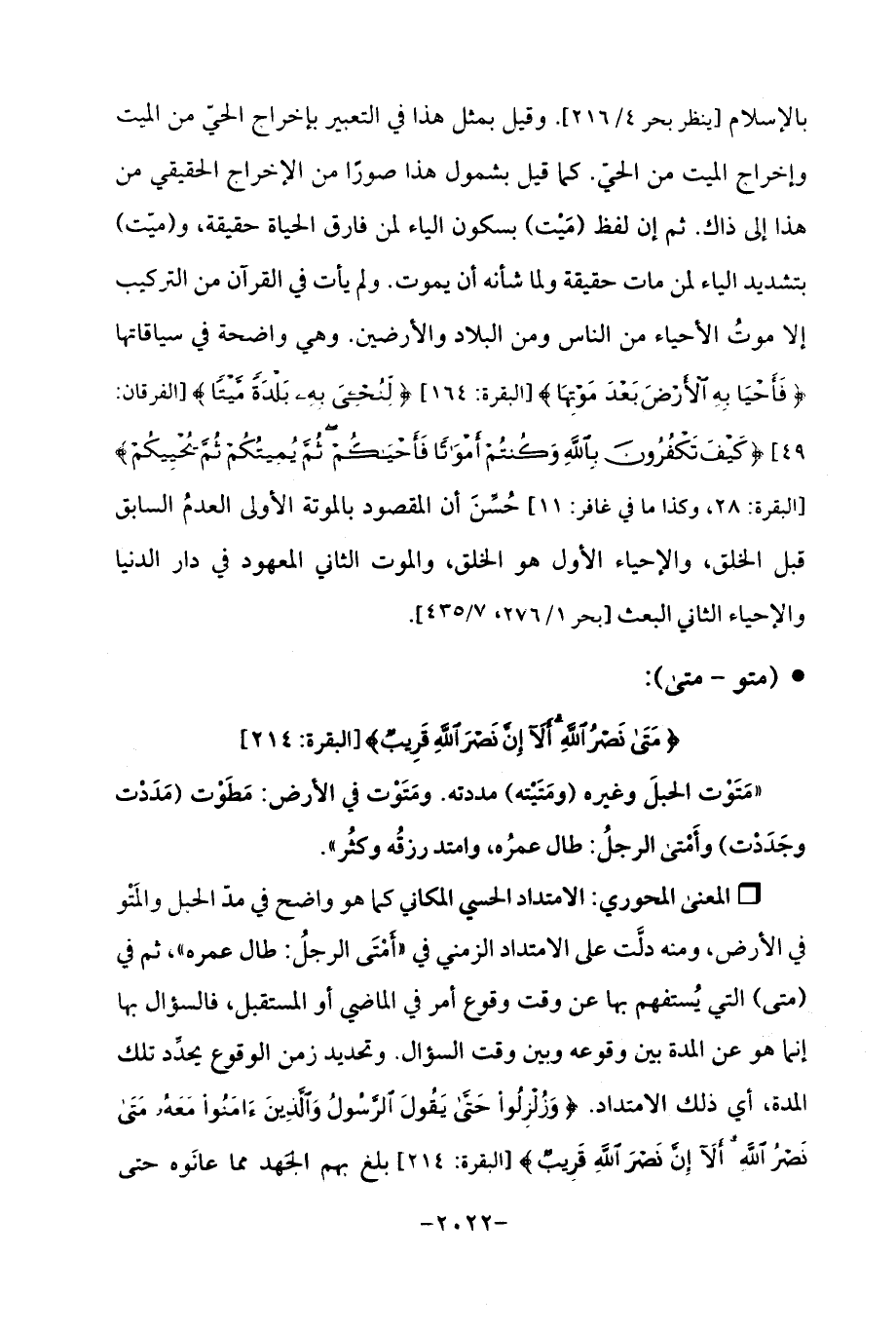 Qالامتداد الحسي المكاني كما هو واضح في مدّ الحبال والمَتْو في الأرض، ومنه دلَّت على الامتداد الزمني في (أَمْتَى الرجلُ: طال عمره "، ثم في (متى) التي يُستفهم بها عن وقت وقوع أمر في الماضي أو المستقبل، فالسؤال بها إنما هو عن المدة بين وقوعه وبين وقت السؤال. وتحديد زمن الوقوع يحدِّد تلك المدة، أي ذلك الامتداد. {وَزُلْزِلُوا حَتَّى يَقُولَ الرَّسُولُ وَالَّذِينَ آمَنُوا مَعَهُ مَتَى نَصْرُ اللَّهِ أَلَا إِنَّ نَصْرَ اللَّهِ قَرِيبٌ} [البقرة: 214] بلغ بهم الجَهد مما عانَوه حتَّى