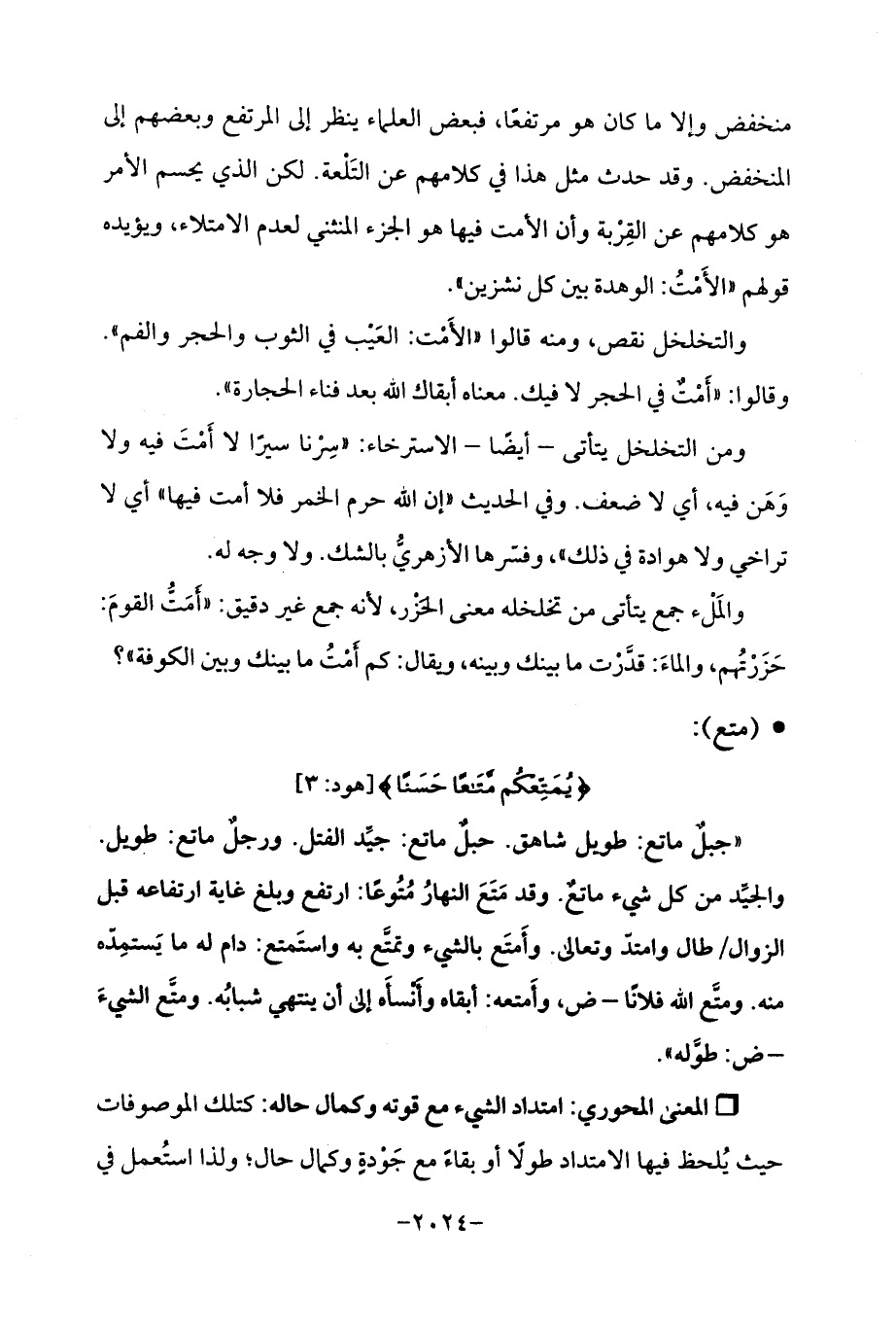 "جبلٌ ماتع: طويل شاهق. حبلٌ ماتع: جيّد الفتل. ورجلٌ ماتع: طويل. والجيِّد من كل شيء ماتعٌ. وقد مَتَعَ النهارُ مُتُوعًا: ارتفع وبلغ غاية ارتفاعه قبل الزوال / طال وامتدّ وتعالى. وأَمتَع بالشيء وتمتَّع به واستَمتع: دام له ما يَستمِدّه منه. ومتَّع الله فلانًا - ض، وأَمتعه: أبقاه وأَنْسأَه إلى أن ينتهي شبابُه. ومتَّع الشيءَ - ض: طوَّله ".