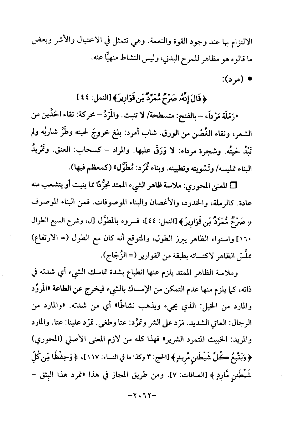 Qملاسة ظاهر الشيء الممتد تجرُّدًا مما ينبت أو يتشعب منه عادة كالرملة، والخدود، والأغصان والباء الموصوفات. فمن البناء الموصوف {صَرْحٌ مُمَرَّدٌ مِنْ قَوَارِيرَ} [النمل: 44]، فسروه بالمطوَّل [ل، وشرح السبع الطوال 160] واستواء الظاهر يبرز الطول، والمتوقع أنه كان مع الطول (= الارتفاع) مملَّسَ الظاهر لاكتسائه بطبقة من القوارير (= الزُجَاج).