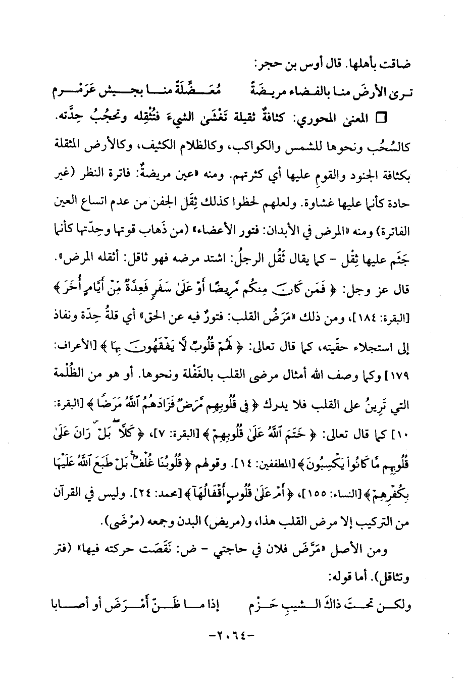 Qكثافةٌ ثقيلة تَغْشَى الشيءَ فتُثْقِله وتحجُبُ حِدَّته. كالسُحُب ونحوها للشمس والكواكب، وكالظلام الكثيف، وكالأرض المثقلة بكثافة الجنود والقومِ عليها أي كثرتهم. ومنه "عن مريضةٌ: فاترة النظر (غير حادة كأنما عليها غشاوة. ولعلهم لحظوا كذلك ثِقَل الجفن من عدم اتساع العين الفاترة) ومنه "المرض في الأبدان: فتور الأعضاء " (من ذَهاب قوتها وحِدّتها كأنما جَثَم عليها ثِقْل -كما يقال ثَقُل الرجلُ: اشتد مرضه فهو ثاقل: أئقله المرض ". قال عزَّ وجلَّ: {فَمَنْ كَانَ مِنْكُمْ مَرِيضًا أَوْ عَلَى سَفَرٍ فَعِدَّةٌ مِنْ أَيَّامٍ أُخَرَ} [البقرة: 184]، ومن ذلك "مَرَضُ القلب: فتورٌ فيه عن الحق "أي قلةُ حِدّة ونفاذ إلى استجلاء حقّيته، كما قال تعالى: {لَهُمْ قُلُوبٌ لَا يَفْقَهُونَ بِهَا} [الأعراف: 179] وكما وصف الله أمثال مرضى القلب بالغَفْلة ونحوها. أو هو من الظُلْمة التي تَرِينُ على القلب فلا يدرك {فِي قُلُوبِهِمْ مَرَضٌ فَزَادَهُمُ اللَّهُ مَرَضًا} [البقرة: 10] كما قال تعالى: {خَتَمَ اللَّهُ عَلَى قُلُوبِهِمْ} [البقرة: 7]، {كَلَّا بَلْ رَانَ عَلَى قُلُوبِهِمْ مَا كَانُوا يَكْسِبُونَ} [المطففين: 14]. وقولهم {قُلُوبُنَا غُلْفٌ بَلْ لَعَنَهُمُ اللَّهُ بِكُفْرِهِمْ} [البقرة: 88] {أَمْ عَلَى قُلُوبٍ أَقْفَالُهَا} [محمد: 24]. وليس في القرآن من التركيب إلا مرض القلب هذا، و (مريض) البدن وجمعه (مرْضَى).