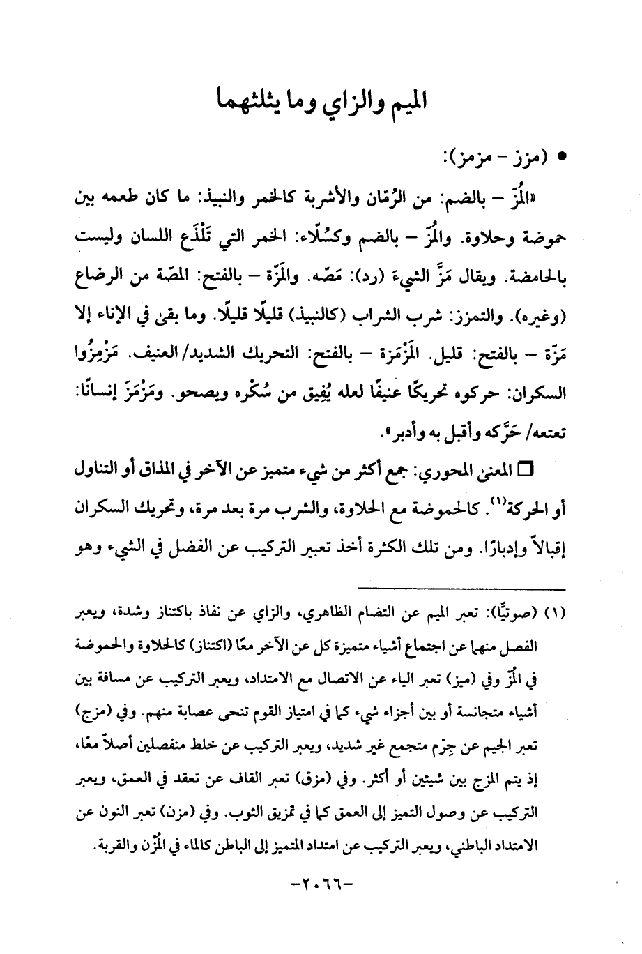 "المُزّ- بالضم: من الرُمّان والأشربة كالخمر والنبيذ: ما كان طعمه بين حموضة وحلاوة. والمُر- بالضم وكسُلّاء: الخمر التي تَلْذَع اللسان وليست بالحامضة. ويقال مَزَّ الشيءَ (رد): مَصّه. والمَزّة- بالفتح: المصّة من الرضاع (وغيره). والتمزز: شرب الشراب (كالنبيذ) قليلًا قليلًا. وما بقى في الإناء إلا مَزّة -بالفتح: قليل. المَزْمَزة- بالفتح: التحريك الشديد / العنيف. مَزْمِزُوا السكران: حركوه تحريكًا عنيفًا لعله يُفيق من سُكْره وبصحو. ومَزْمَزَ إنسانًا: تعتعه / حَرَّكه وأقبل به وأدبر ".