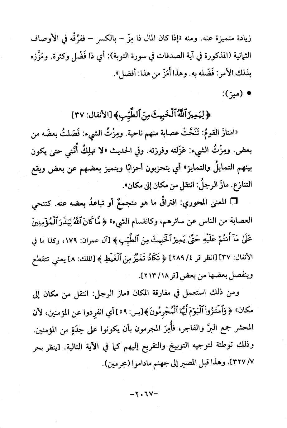 Qافتراقُ ما هو متجمعٌ أو تباعدُ بعضه عنه. كتنحي العصابة من الناس عن سائرهم، وكانقسام الشيء " {مَا كَانَ اللَّهُ لِيَذَرَ الْمُؤْمِنِينَ عَلَى مَا أَنْتُمْ عَلَيهِ حَتَّى يَمِيزَ الْخَبِيثَ مِنَ الطَّيِّبِ} [آل عمران: 179، وكذا ما في الانفال: 37] [انظر قر 4/ 289] {تَكَادُ تَمَيَّزُ مِنَ الْغَيظِ} [الملك: 8] يعني تتقطع وينفصل بعضها من بعض [قر 18/ 213].