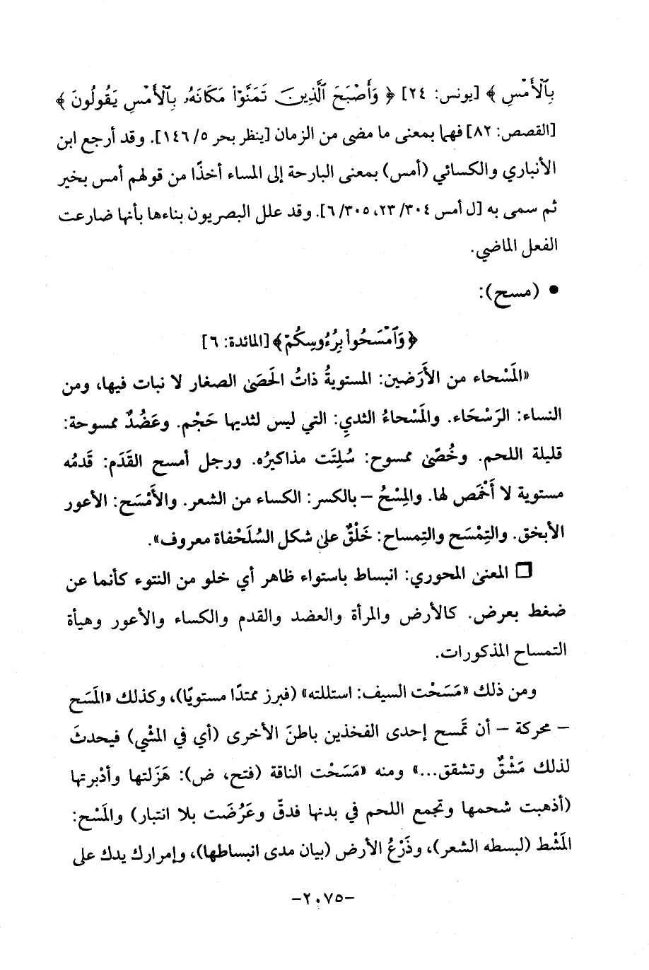 "المَسْحاء من الأَرَضين: المستويةُ ذاتُ الحَصَى الصغار لا نبات فيها، ومن النساء: الرَسْحَاء. والمَسْحاءُ الثديِ: التي ليس لثديها حَجْم. وعَضُدٌ ممسوحة: قليلة اللحم. وخُصًى ممسوح: سُلِتَت مذاكيرُه. ورجل أمسح القَدَم: قَدمُه مستوية لا أَخْمَص لها. والمِسْحُ- بالكسر: الكساء من الشعر. والأَمْسَح: الأعور الأبخق. والتِمْسَح والتِمساح: خَلْقٌ على شكل السُلَحْفاة معروف ".