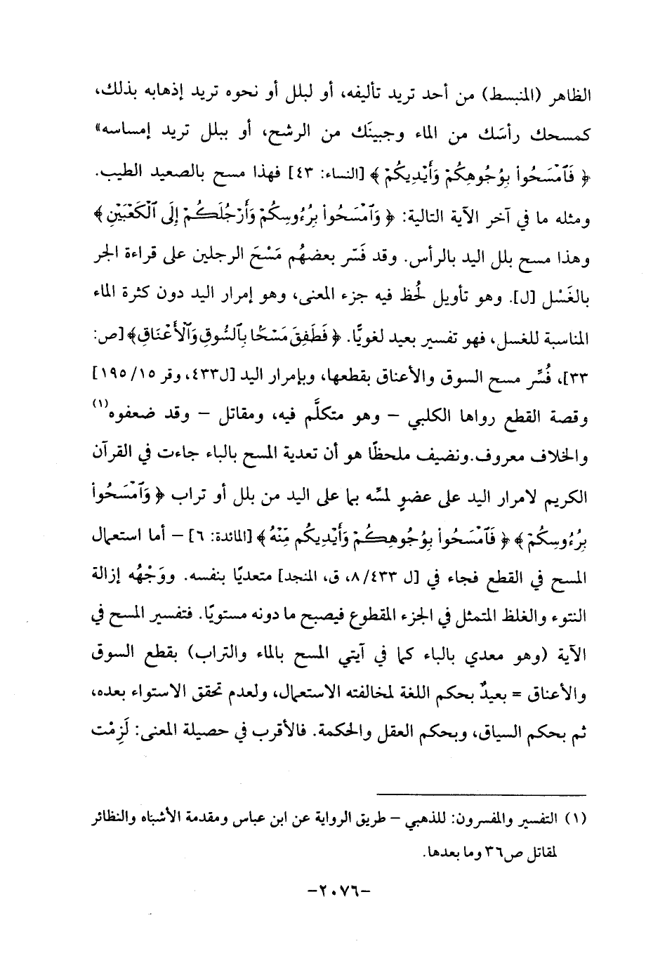الظاهر (المنبسط) من أحد تريد تأليفه، أو لبلل أو نحوه تريد إذهابه بذلك، كمسحك رأسَك من الماء وجبينَك من الرشح، أو ببلل تريد إمساسه " {فَامْسَحُوا بِوُجُوهِكُمْ وَأَيدِيكُمْ} [النساء: 43] فهذا مسح بالصعيد الطيب. ومثله ما في آخر الآية التالية: {وَامْسَحُوا بِرُءُوسِكُمْ وَأَرْجُلَكُمْ إِلَى الْكَعْبَينِ} وهذا مسح بلل اليد بالرأس. وقد فَسّر بعضهُم مَسْحَ الرجلين على قراءة الجر بالغَسْل [ل]. وهو تأويل لحُظ فيه جزء المعنى، وهو إمرار اليد دون كثرة الماء المناسبة للغسل، فهو تفسير بعيد لغويًّا. {فَطَفِقَ مَسْحًا بِالسُّوقِ وَالْأَعْنَاقِ} [ص: 33]، فُسِّر مسح السوق والأعناق بقطعها، وبإمرار اليد [ل 433، وقر 15/ 195] وقصة القطع رواها الكلبي -هو متكلَّم فيه، ومقاتل- وقد ضعفوه (¬1) والخلاف معروف. ونضيف ملحظًا هو أن تعدية المسح بالباء جاءت في القرآن الكريم لامرار اليد على عضوٍ لمسِّه بما على اليد من بلل أو تراب {وَامْسَحُوا بِرُءُوسِكُمْ} {فَامْسَحُوا بِوُجُوهِكُمْ وَأَيدِيكُمْ مِنْهُ} [المائدة: 6]- أما استعمال المسح في القطع فجاء في [ل 433/ 8، ق، المنجد] متعديًا بنفسه. ووَجْهُه إزالة النتوء والغلظ المتمثل في الجزء المقطوع فيصبح ما دونه مستويًا. فتفسير المسح في الآية (وهو معدي بالباء كما في آيتي المسح بالماء والتراب) بقطع السوق والأعناق = بعيدٌ بحكم اللغة لمخالفته الاستعمال، ولعدم تحقق الاستواء بعده، ثم بحكم السياق، وبحكم العقل والحكمة. فالأقرب في حصيلة المعنى: لَزِمْت