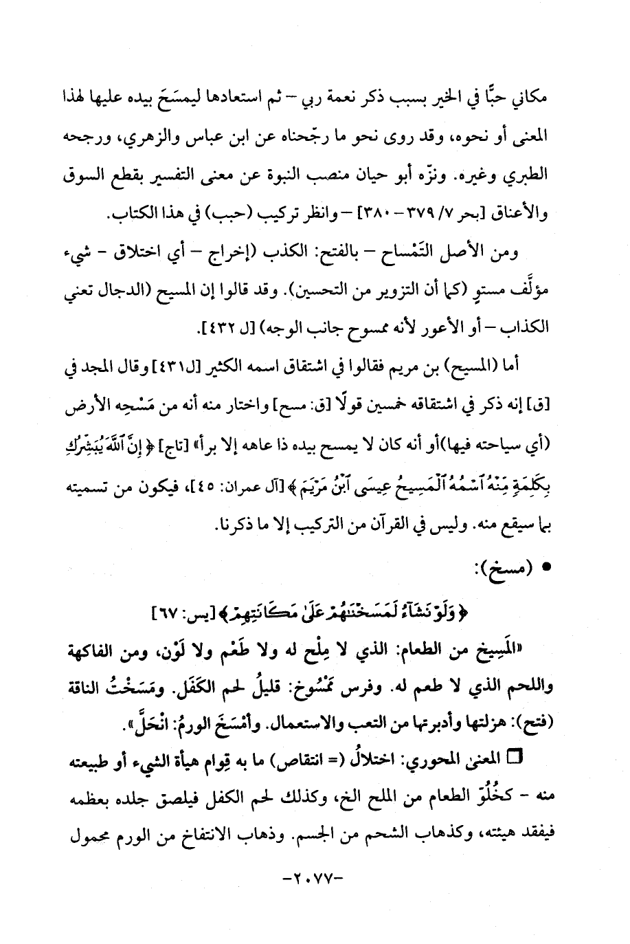 أما (المسيح) بن مريم فقالوا في اشتقاق اسمه الكثير [ل 431] وقال المجد في [ق] إنه ذكر في اشتقاقه خمسين قولًا [ق: مسح] واختار منه أنه من مَسْحِه الأرض (أي سياحته فيها) أو أنه كان لا يمسح بيده ذا عاهه إلا برأ " [تاج] {إِنَّ اللَّهَ يُبَشِّرُكِ بِكَلِمَةٍ مِنْهُ اسْمُهُ الْمَسِيحُ عِيسَى ابْنُ مَرْيَمَ} [آل عمران: 45]، فيكون من تسميته بما سيقع منه. وليس في القرآن من التركيب إلا ما ذكرنا.