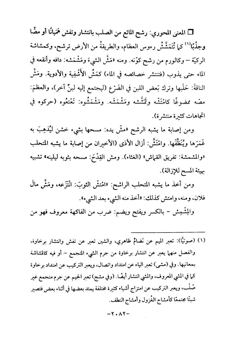 Qرشح المائع من الصلب بانتشار وتفش هَمَيانًا أو مصًّا وجذْبًا (¬1) كما تُتَمَشَّشُ رءوس العظام، والطريقةُ من الأرض ترشح، وكمشاشة الركيّة - وكالورم من رشح كوّنه. ومنه "مَشَّ الشيءَ ومَشْمَشه: دافه وأنقعه في الماء حتى يذوب (فتنتشر خصائصه في الماء) كمَشِّ الأَشْفِية والأدوية. ومَشَّ الناقةَ: حَلَبها وترك بَعض اللبن في الضَرْع (ليجتمع إليه لبنٌ آخر)، والعظمَ: مصّه ممضوغًا كامْتَشّه وتَمَشَّشه ومَشْمَشَه. ومَشْمَشُوه: تَعْتعُوه (حركوه في اتجاهات كثيرة منتشرة).