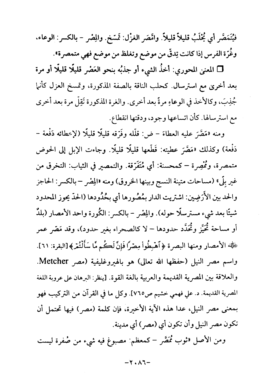 ومنه "مَصَّرَ عليه العطاءَ - ض: قلّله وفَرّقه قليلًا قليلًا (لإعطائه دَفْعة - دَفعة) وكذلك "مَصَّرَ عطيته: قَطّعها قليلًا قليلًا. وجاءت الإبل إلى الحوض متمصرة، ومُمْصِرة - كمحسنة: أي مُتَفَرّقة. والتمصير في الثياب: التخرق من غير بِلًى " (مساحات متينة النسج وبينها الخروق) ومنه "المِصْر - بالكسر: الحاجز والحد بين الأَرَضِين: اشتريت الدار بمُصُورها أي بحُدُودها (الحدّ يحوز المحدود شيئًا بعد شيء مسترسلًا حوله). والمِصْر - بالكسر: الكُورة واحد الأمصار (بلدٌ أو مساحة تُحَيَّز وتُحَدَّد حدودها - لا كالصحراء بغير حدود)، وقد مَصَّر عمر - رضي الله عنه - الأمصار ومنها البصرة {اهْبِطُوا مِصْرًا فَإِنَّ لَكُمْ مَا سَأَلْتُمْ} [البقرة: 61]. واسم مصر النيل (حفظها الله تعالى) هو بالهيروغليفية (مصر Metcher. والعلاقة بين المصرية القديمة والعربية بالغة القوة -[ينظر: البرهان على عروبة اللغة المصرية القديمة. د. علي فهمي خشيم ص 765]. وكل ما في القرآن من التركيب فهو بمعنى مصر النيل، عدا هذه الآية الأخيرة، فإن كلمة (مصر) فيها تحتمل أن تكون مصر النيل وأن تكون أي (مصر) أي مدينة.