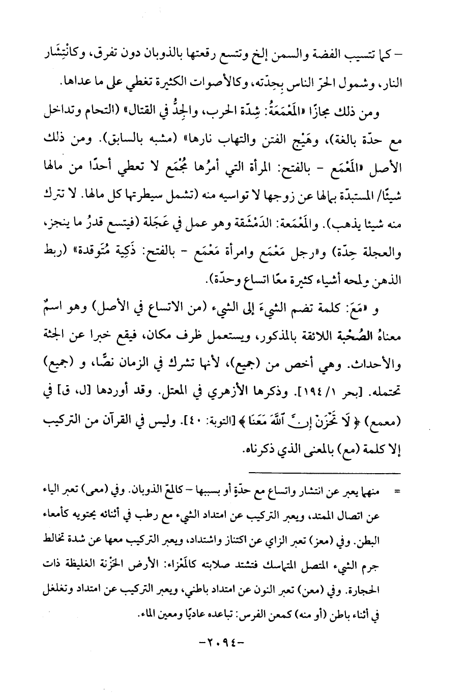 و"مَعَ: كلمة تضم الشيءَ إلى الشيء (من الاتساع في الأصل) وهو اسمٌ معناهُ الصُحْبة اللائقة بالمذكور، ويستعمل ظرف مكان، فيقع خبرا عن الجثة والأحداث. وهي أخص من (جميع)، لأنها تشرك في الزمان نصًّا، و (جميع) تحتمله. [بحر 1/ 194]. وذكرها الأزهري في المعتل. وقد أوردها [ل، ق] في (معمع) {لَا تَحْزَنْ إِنَّ اللَّهَ مَعَنَا} [التوبة: 40]. وليس فِي القرآن من التركيب إلا كلمة (مع) بالمعنى الذي ذكرناه.