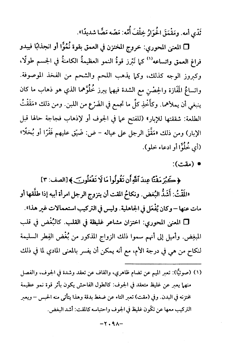 (¬1) (صوتيًّا): تعبر الميم عن تضام ظاهري، والقاف عن تعقد وشدة في الجوف، والفصل منهما يعبر عن غليظ متعقد في الجوف: كالطول الفاحش يكون بأثر قوة نمو عظيمة مختزنه في البدن. وفي (مقت) تعبر التاء عن ضغط بدقة وهذا يتأتى منه الحبس- ويعبر التركيب معها عن تكون غليظ في الجوف واحتباسه كالمقت: أشد البغض.