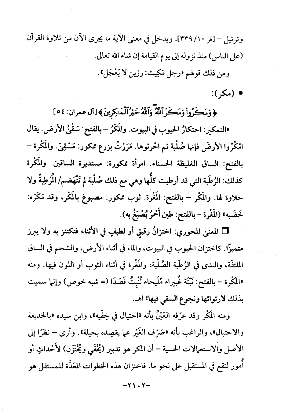 ومنه المكر وقد عرّفه العَينُ بأنه "احتيال في خِفْيه "، وابن سيده "بالخديعة والاحتيال "، والراغب بأنه "صَرْف الغَير عما يقصِده بحيلة ". وأرى -نظرًا إلى الأصل والاستعمالات الحسية- أن المكر هو تدبير (يُخْفَي ويُخْتَزَن) لأَحْداثٍ أو أُمور لتقع في المستقبل على نحو ما. فاختزان هذه الخطوات المعَدَّة للمستقبل هو