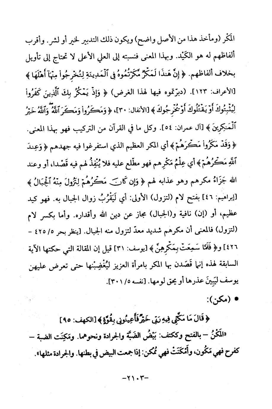 المكر (ومأخذ هذا من الأصل واضح) ويكون ذلك التدبر لخير أو لشر. وأقرب ألفاظهم له هو الكيد. وبهذا المعنى فنسبته إلى العلي الأعلى لا تحتاج إلى تأويل بخلاف ألفاظهم. {إِنَّ هَذَا لَمَكْرٌ مَكَرْتُمُوهُ فِي الْمَدِينَةِ لِتُخْرِجُوا مِنْهَا أَهْلَهَا} [الأعراف: 123]. (دبرّتموه فيها لهذا الغرض) {وَإِذْ يَمْكُرُ بِكَ الَّذِينَ كَفَرُوا لِيُثْبِتُوكَ أَوْ يَقْتُلُوكَ أَوْ يُخْرِجُوكَ} [الأنفال: 30]، {وَمَكَرُوا وَمَكَرَ اللَّهُ وَاللَّهُ خَيرُ الْمَاكِرِينَ (54)} [آل عمران: 54]. وكل ما في القرآن من التركيب فهو بهذا المعنى. {وَقَدْ مَكَرُوا مَكْرَهُمْ} أي المكر العظيم الذي استفرغوا فيه جهدهم {وَعِنْدَ اللَّهِ مَكْرُهُمْ} أي عِلمُ مَكرِهم فهو مطّلع عليه فلا يُنْفِذُ لهم فيه قَصدا، أو وعند الله جَزَاءُ مكرهم وهو عذابه لهم {وَإِنْ كَانَ مَكْرُهُمْ لِتَزُولَ مِنْهُ الْجِبَالُ} [إبراهيم: 46] بفتح لام (لتزول) الأولى: أي لَتقرُبُ زوال الجبال به. فهو كيد عظيم، أو (إن) نافية و (الجبال) مجاز عن دين الله وأقداره. وأما بكسر لام (لتزول) فالمعنى أن مكرهم شديد معدّ لتزول منه الجبال. [ينظر بحر 5/ 425 - 426] و {فَلَمَّا سَمِعَتْ بِمَكْرِهِنَّ} [يوسف: 31] قيل إن المقالة التي حكتها الآية السابقة لهذه إنما قَصَدن بها المكر بامرأة العزيز ليُغضِبنها حتى تعرض عليهن يوسف ليَبِينَ عذرها أو يحق لومها. [نفسه 5/ 301].