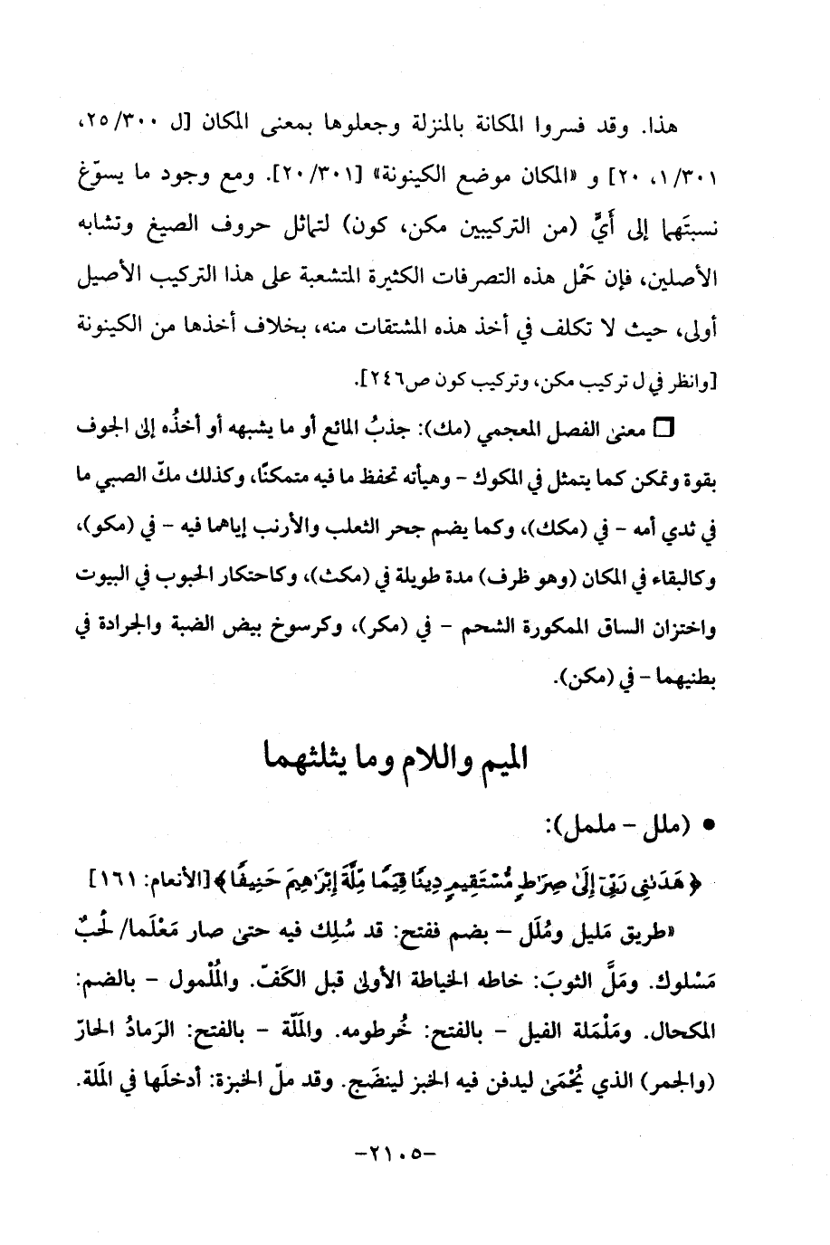 هذا. وقد فسروا المكانة بالمنزلة وجعلوها بمعنى المكان [ل 300/ 25، 301/ 1، 20] و "المكان موضع الكينونة " [301/ 20]. ومع وجود ما يسوّغ نسبتَهما إلى أيٍّ (من التركيبين مكن، كون) لتماثل حروف الصيغ وتشابه الأصلين، فإن حَمل هذه التصرفات الكثيرة المتشعبة على هذا التركيب الأصيل أولى، حيث لا تكلف في أخذ هذه المشتقات منه، بخلاف أخذها من الكينونة [وانظر في ل تركيب مكن، وتركيب كون ص 246].