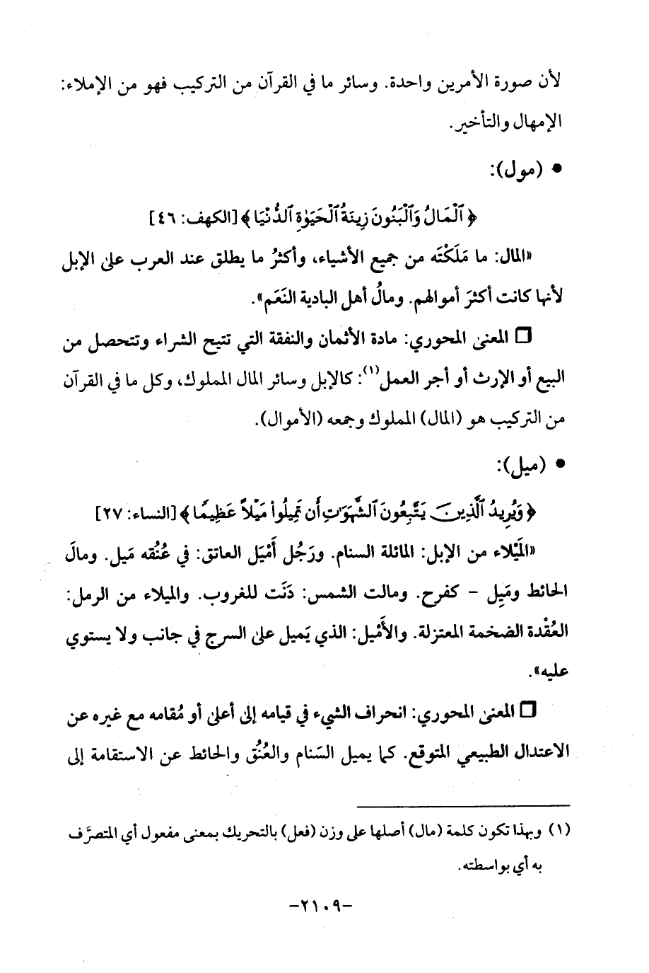 (¬1) وبهذا تكون كلمة (مال) أصلها على وزن (فعل) بالتحريك بمعنى مفعول أي المتصرف به أي بواسطته.